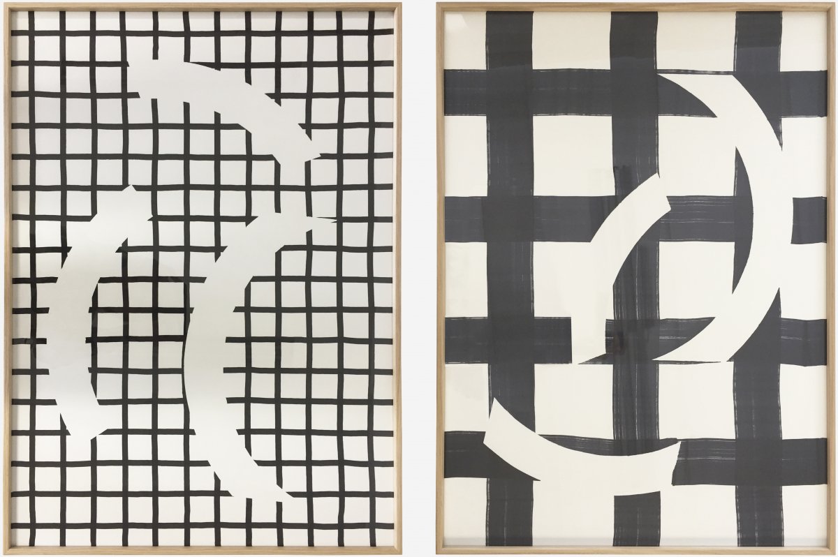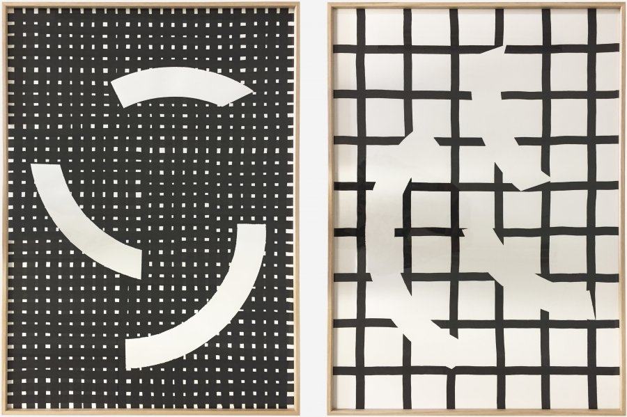 Dans la série de dessins Partitions la question du mouvement est centrale. Une règle du jeu s’instaure pour définir combien de fois les bandes seront jetées sur les feuilles de papiers, comme une partie de dés. Seize fois le geste de lancer les trois arcs de cercles est répété. On retrouve sur les dessins les différentes positions qui se sont proposées.