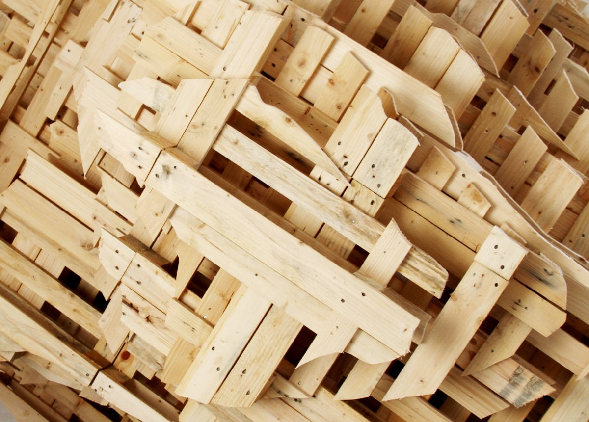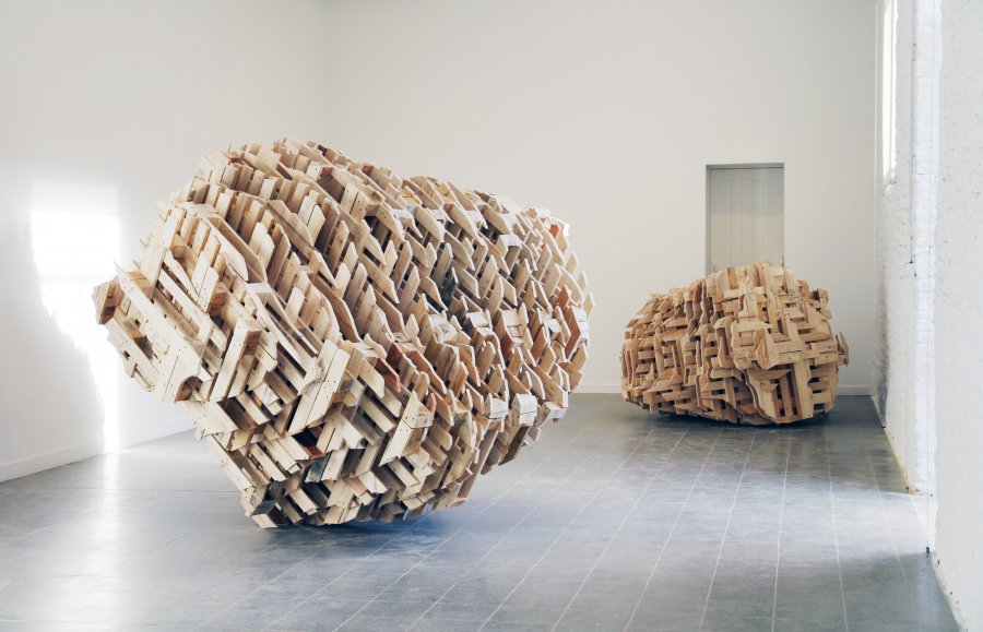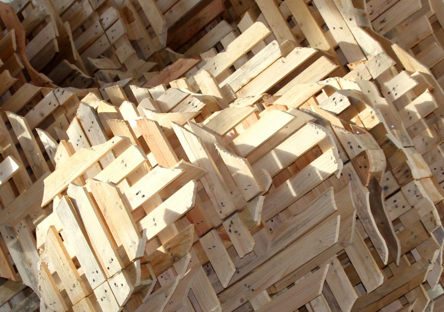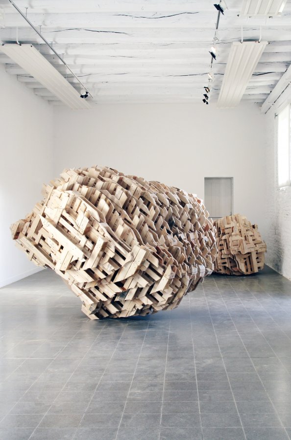 Comme le rappelle Gilles A. Tiberghien, « ce ne sont pas les produits de la nature que l’art imite mais bien son activité productrice». La plupart des artistes ont, en effet, travaillé en résidence à Kerguéhennec, déplaçant lesmodalités de l’in situ, pour faire du paysage la source des œuvres à venir et non leur destination. L’exemple le plus explicite de cette attitude est sans doute la sculpture de Pierre-Alexandre Remy. C’est un énorme entrelacs de rubans de métal et d’élastomère : lignes noires brisées, ondoiements bleus et orange qui reprennent le code couleur des cartes IGN symbolisant les routes, les cours d’eau et les courbes de niveau.La sculpture est donc la réalisation en trois dimensions d’une modélisation bidimensionnelle, la carte des environs de Kerguéhennec, qui est elle-même la transcription d’un espace en volume. L’opération ne retient du paysage que les réseaux de circulation et les réordonne en jouant sur les codes — entre respect et transposition — pour produire une forme nouvelle. Vincent Mauger, quant à lui, a construit deux gros volumes, techniquement simples (un montage de palettes entrecroisées) et complexes du point de vuede leur organisation. La forme globale évoque à la fois la masse d’un rocher, la légèreté d’un nuage, une maquette post-constructiviste et une modélisation informatique. Curieusement, l’aspect bricolage rustique y côtoie la technicitédes sciences de l’ingénieur. Les œuvres de Pierre-Alexandre Remy et de Vincent Mauger ressemblent sans doute aussi à des nuages, mais du genre des tag clouds permettant de visualiser les flux de navigation sur un site Internet.
