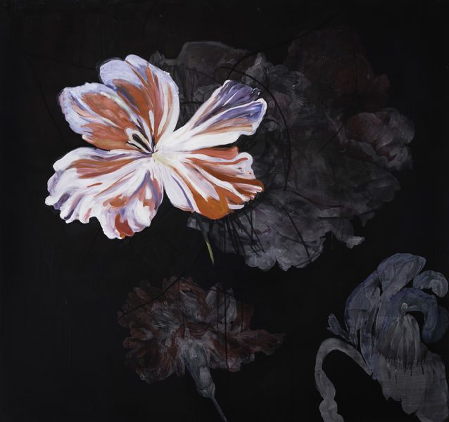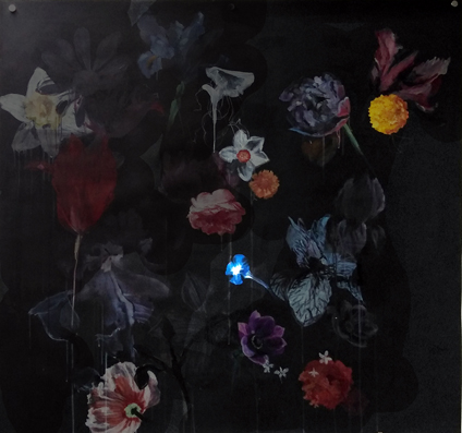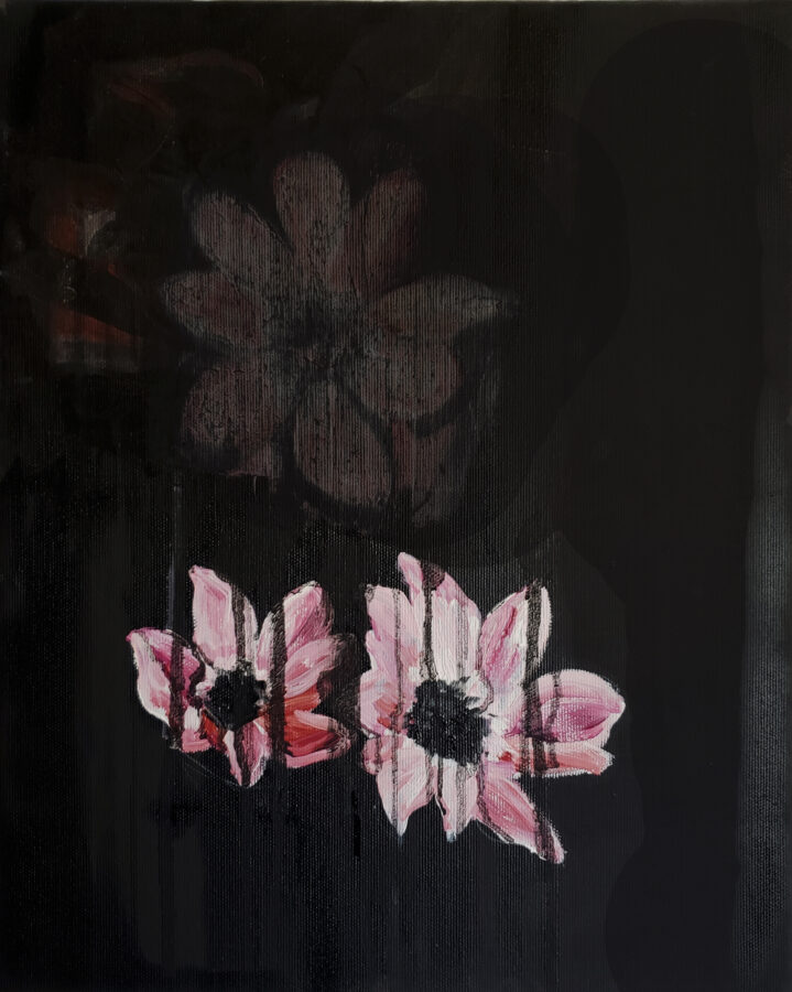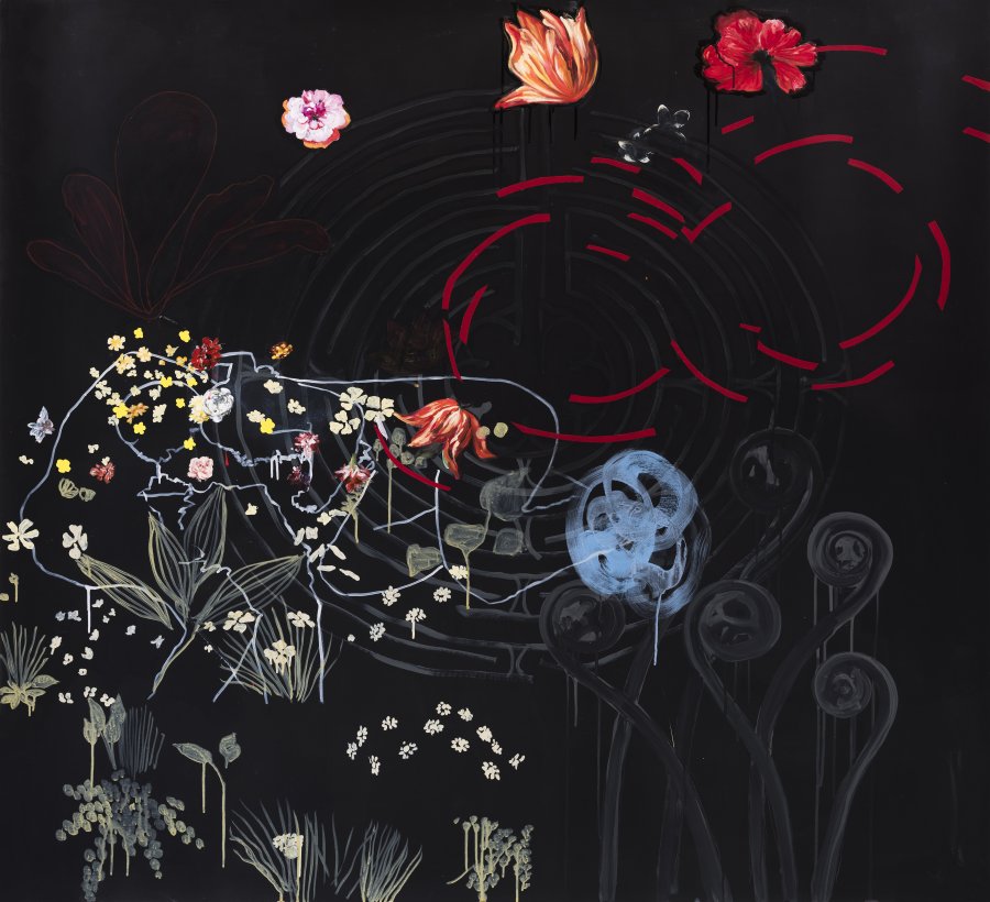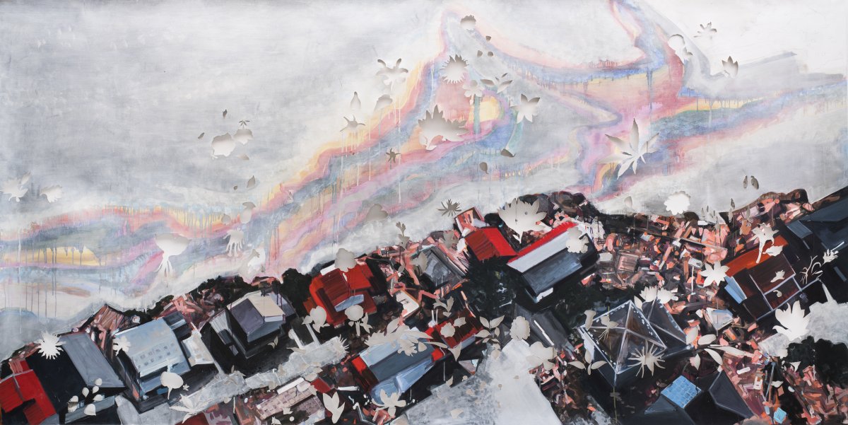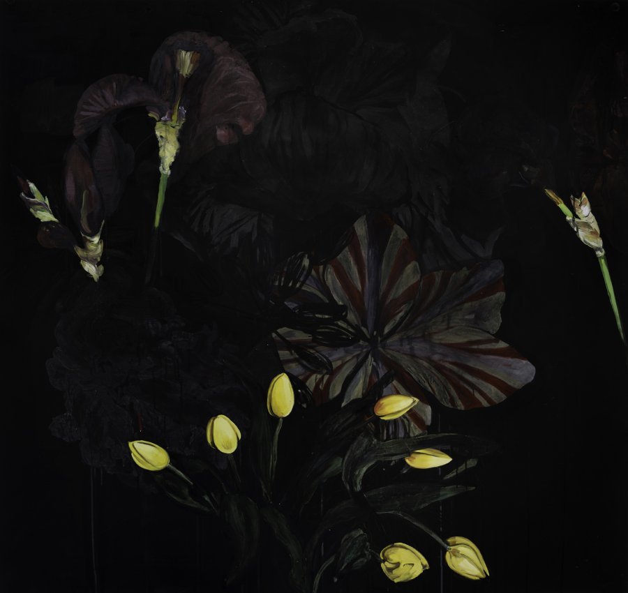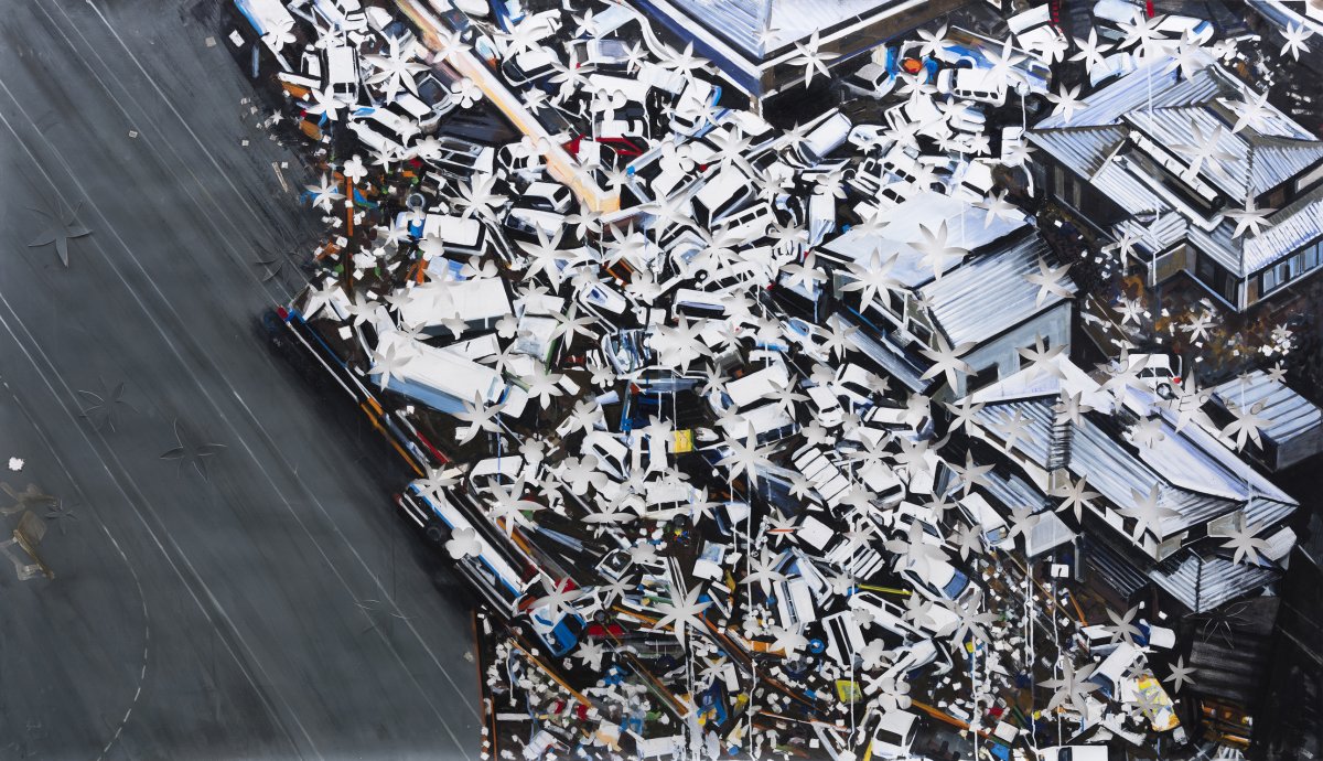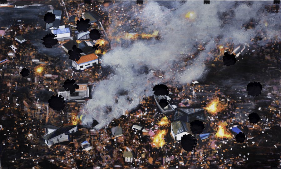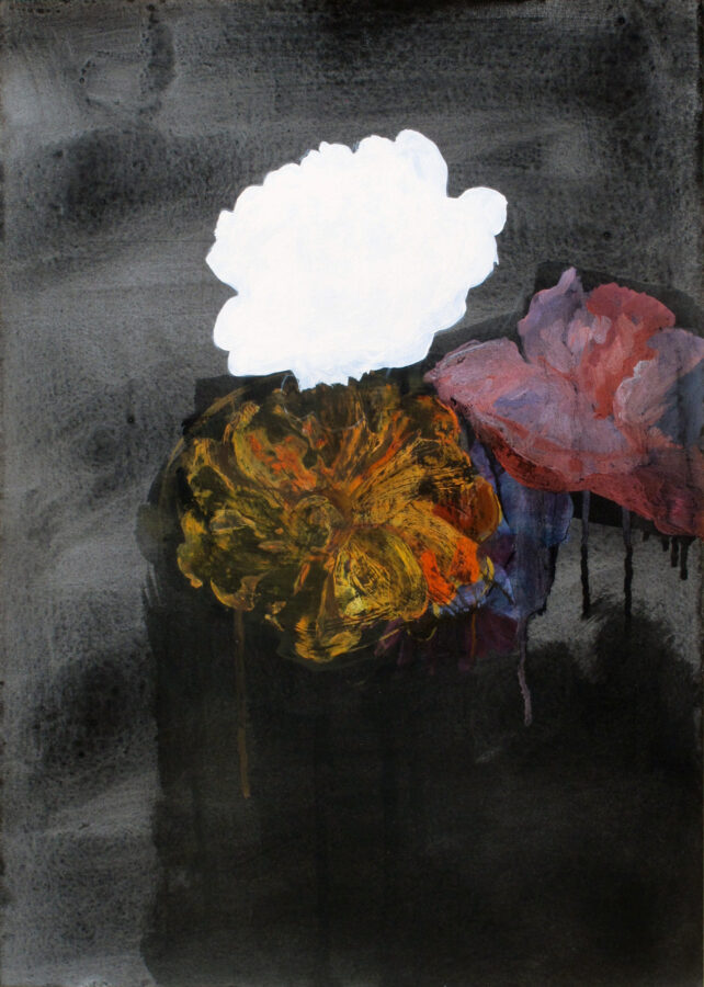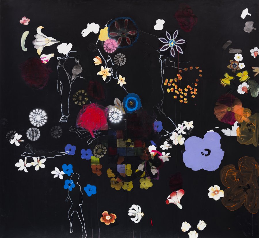 (…) Chercher la densité du motif, c’est aussi le travail de Livia Deville. L’artiste se tourne vers les images de l’actualité qui ont perdu leur poids à force d’être répétées. Elle peint sur de grands papiers noirs. Des fleurs, elle ne conserve que les pétales. Des figures, elle emprunte les postures. Les formes sont tirées de l’histoire de l’art (La Descente de croix de Rembrandt, les Men in the city de Robert Longo ou les Flowers d’Andy Warhol, entre autres ) et de photographies de presse. On pourrait peut-être identifier parmi la foule la journaliste égyptienne Shaim al-Sabagh, assassinée par la police sur la place Tahrir en janvier 2015 alors qu’elle manifestait pacifiquement dans un pays qui interdisait toute revendication démocratique3. « Flowers grow out of dark moments » (Les fleurs poussent sur des moments sombres) écrivait Corita Kent, la nonne du Pop art. Les superpositions de motifs les font remonter à la surface, accompagnés de souvenirs, selon la stratégie du palimpseste. Les silhouettes, quant à elles, sont découpées au cutter et réassemblées ailleurs. Restent parmi les fleurs les contours absents. Sur la cimaise, un jeune homme glissé hors de la feuille confond son corps avec le mur blanc. Quand il entre dans l’espace du dessin, le fond rouge en fait apparaître le profil et révèle la violence de la scène. À quelques centimètres du sol, flottantes, les découpes éparpillées prennent vie comme des personnages de fiction. Aujourd’hui, il n’y a paradoxalement jamais eu aussi peu d’images, écrit la philosophe Marie-José Mondzain, au sens où leur multiplication nous empêche de les rencontrer4. Nous les voyons, mais le visible n’est pas l’image : il faut les faire sienne, les entremêler à notre histoire en les sortant de la page. Reportages télévisés, photographies publicitaires, mises en scène pornographiques, en nous assignant une place autoritaire, nous dévore et nous submerge, quand, chez Livia Deville, c’est le désir qui émerge. Si toute image se laisse convoiter, ce que le manque est sa part inavouée. Nous nous surprenons à tisser des correspondances entre les incisions du papier fleuri et les corps aux poses élastiques de yogi. Les deux grandes compositions inspirées de l’accident nucléaire de Fukushima en mars 2011 et des nappes d’hydrocarbures s’écoulant dans la mer se donnent des allures de peintures d’histoire. Pourtant, loin de les cristalliser en mythes, elles multiplient les points de vue sur la catastrophe. Les perspectives axonométriques des villes désertées et les méandres colorés des éléments contaminés ont frappé le paysage d’irréalité.