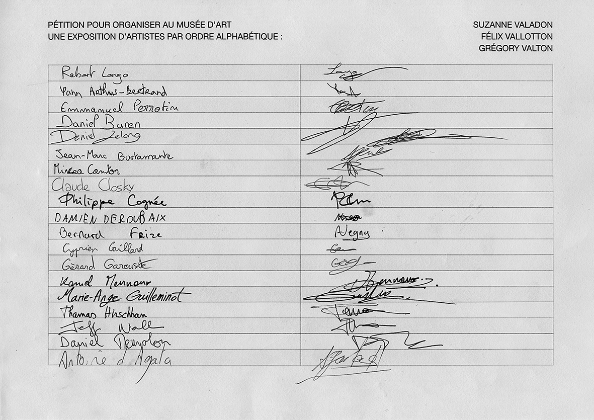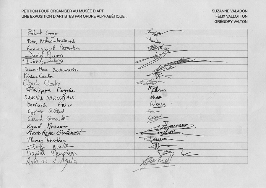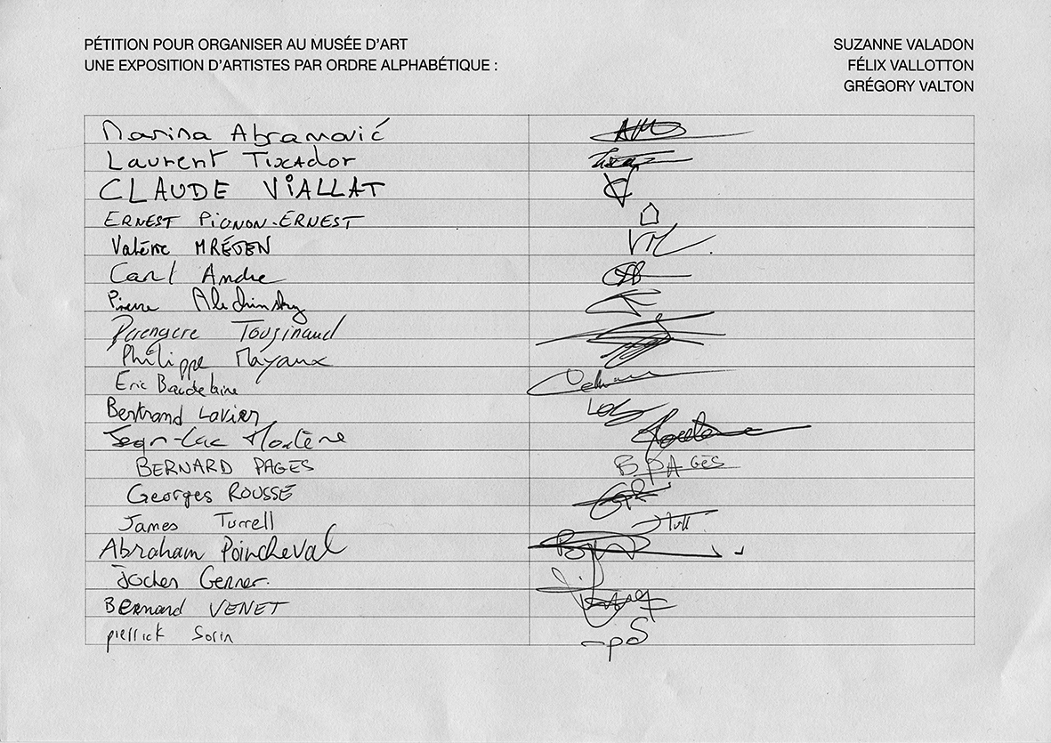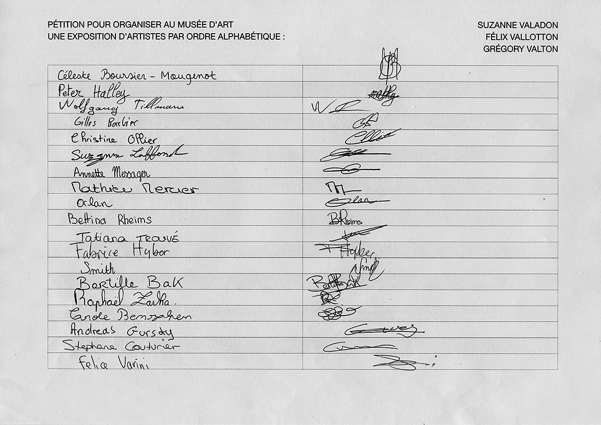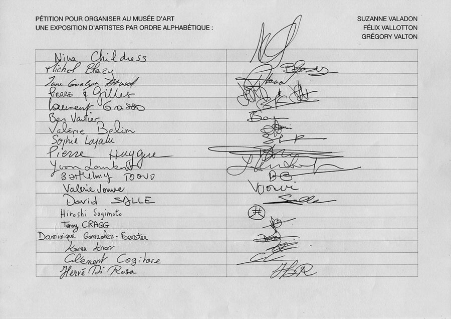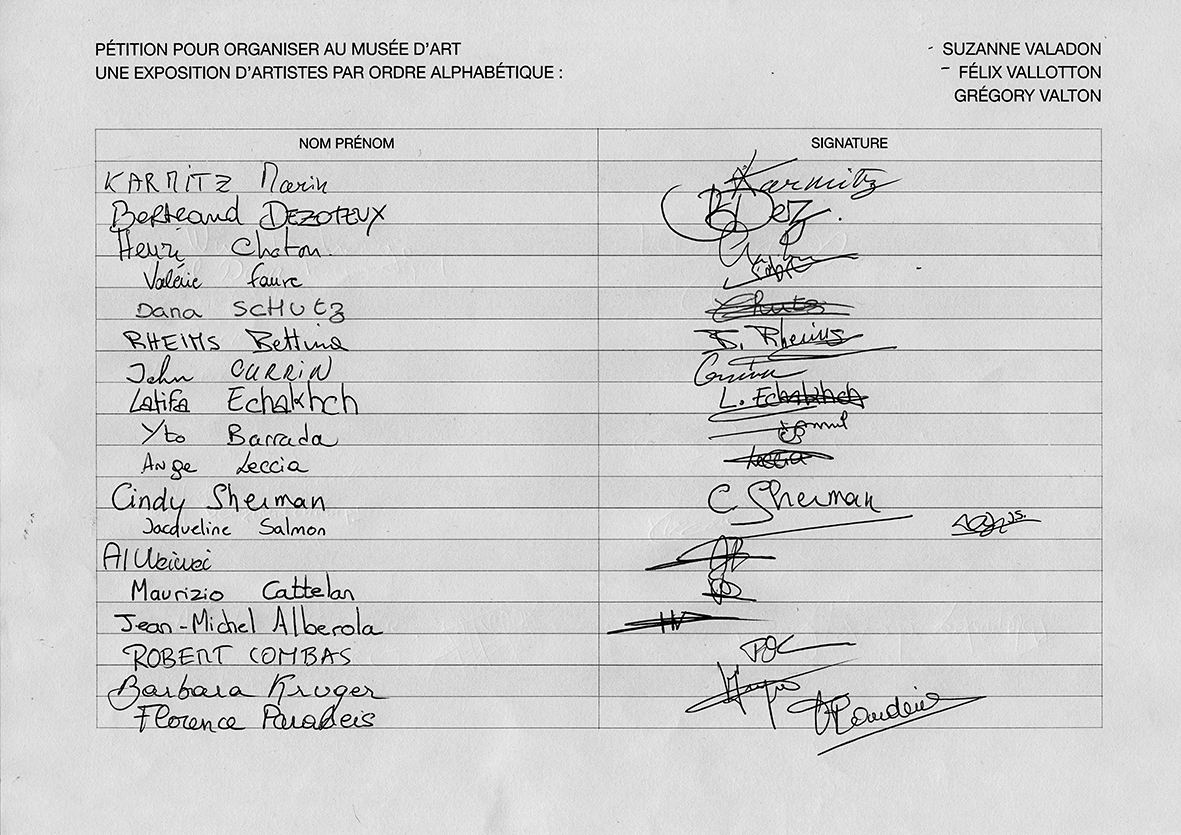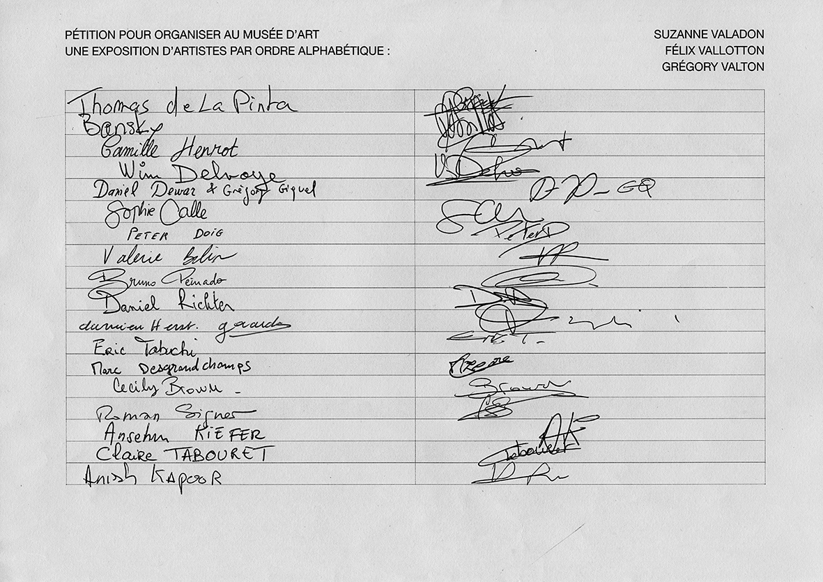 Du 27 octobre 2023 au 11 février 2024 a lieu au musée d’art de Nantes l’exposition de la peintre Suzane Valadon. Je propose au musée de continuer d’organiser des expositions d’artistes par ordre alphabétique. Aussi du 7 avril au 3 septembre 2024 serait montrer les œuvres du peintre Félix Vallotton. Puis du 7 novembre 2024 au 16 février 2025 sera montrée une sélection de mes pièces. Pour appuyer ma demande, je fais signer les 100 plus grands artistes internationaux vivants. De plus, le transport de mes pièces ne coûtera pas cher car je vois le musée depuis chez moi, donc je pourrai venir à pied.