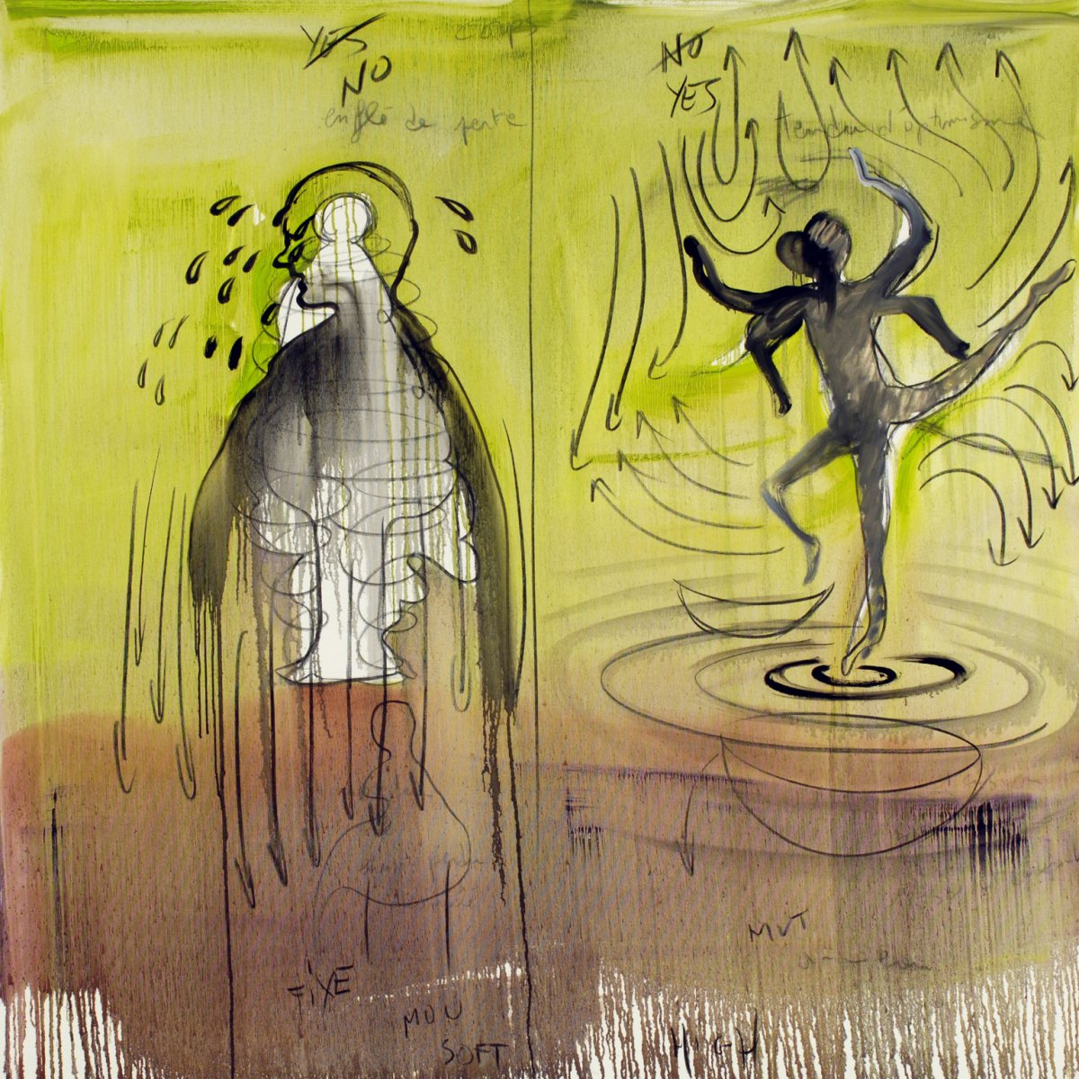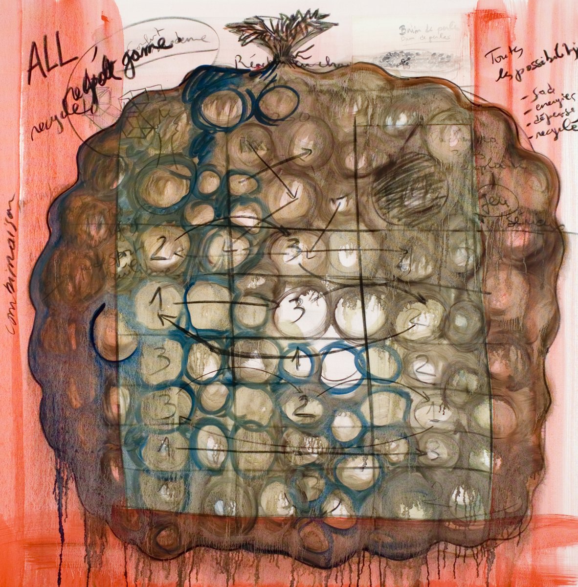 Usant du fusain sur la toile comme sur une planche de bande dessinée, Fabrice Hyber laisse ses «personnages» naturels (végétaux et paysages) se débattre dans un environnement qui leur est hostile.