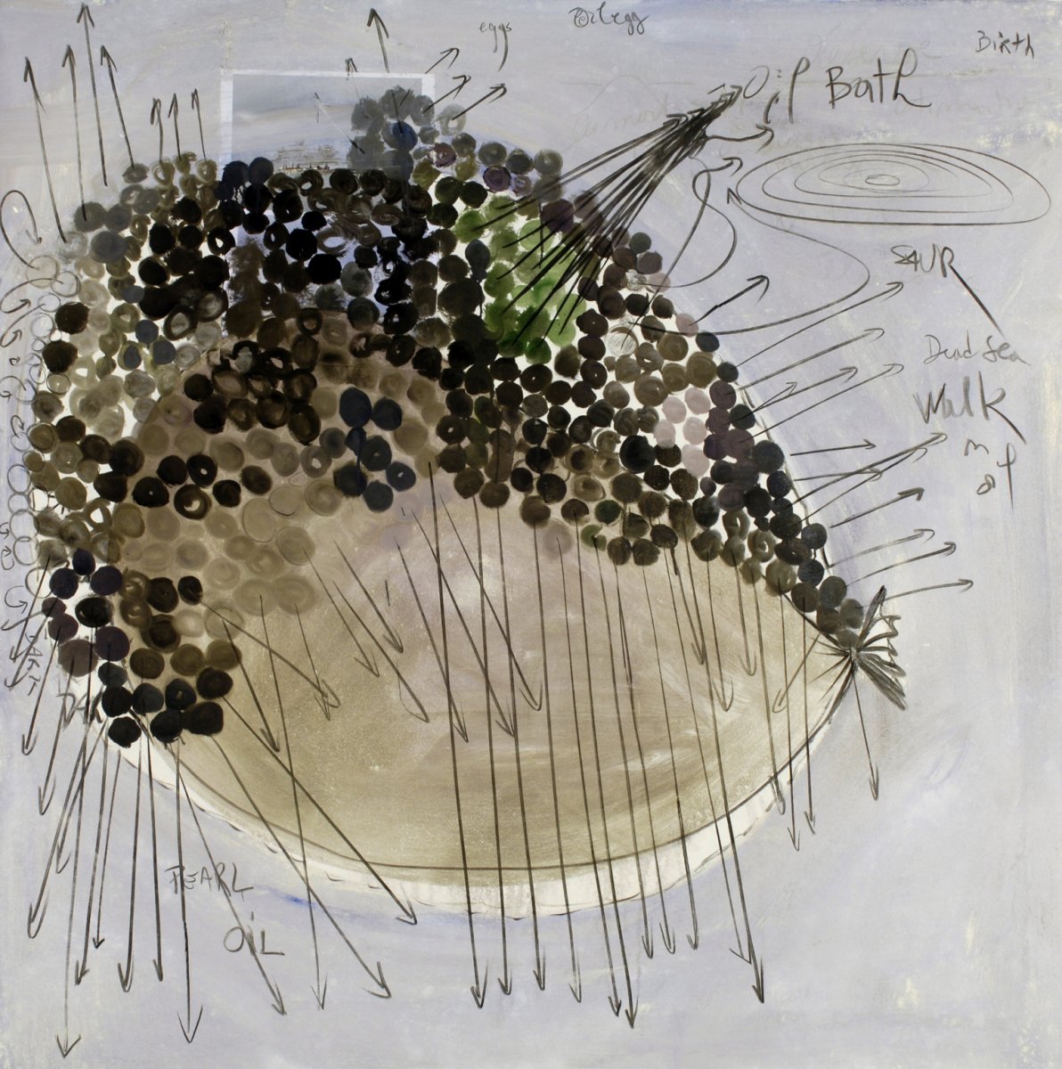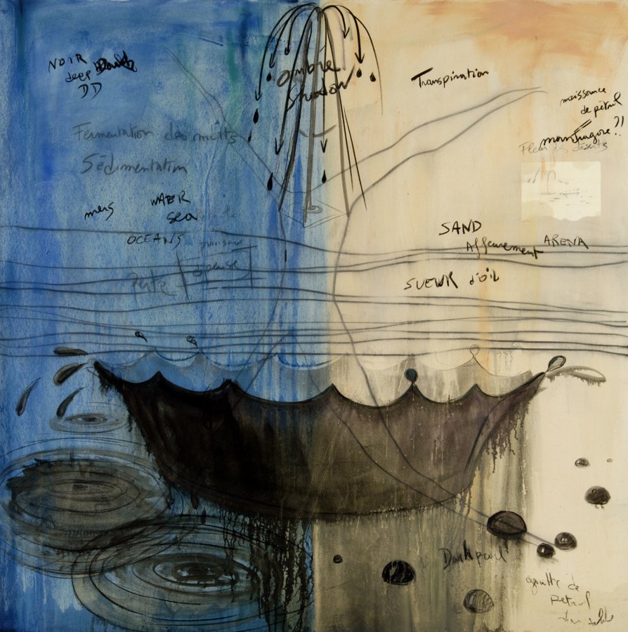 Fleur des déserts scinde un paysage en deux zones distinctes, éclaboussées d’une grosse goutte noire: le sable jaune, à droite, est jonché de mots tels que «transpiration», «naissance de pétrole», «sand», ou «affleurement». En face, l’eau bleue est ponctuée, au fusain, de «noir», «deep», «fermentation des mots».