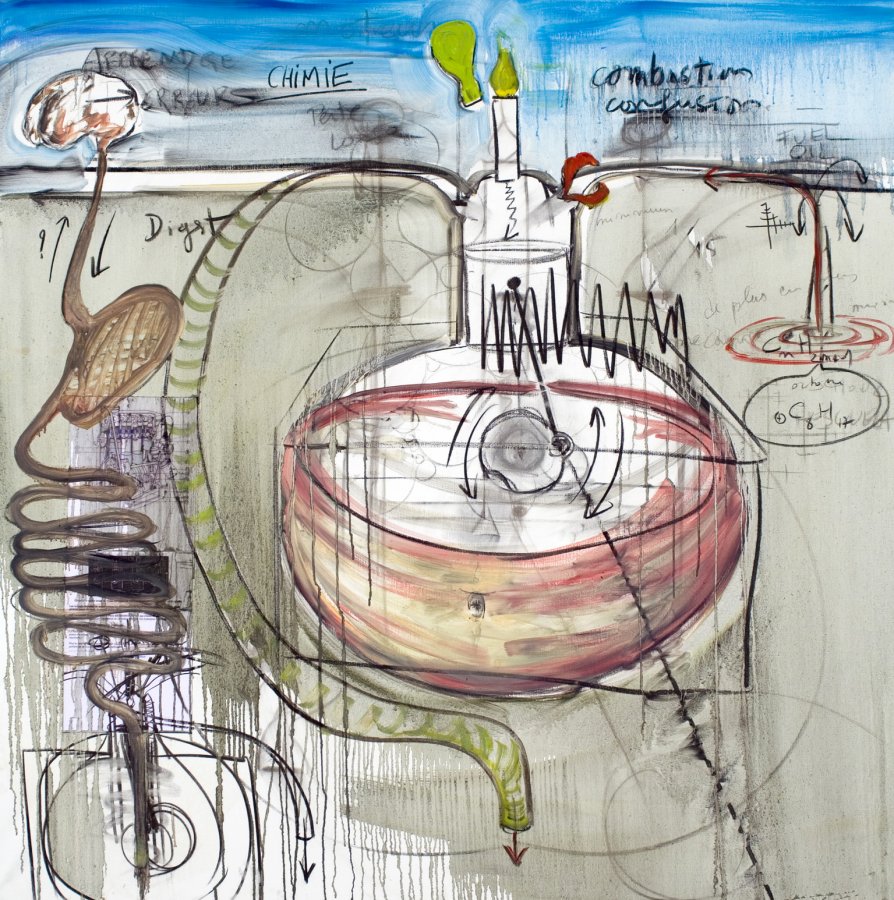 Dans Combustion, confusion, le dynamisme du trait sert à évoquer le fonctionnement du corps, à l’aide de l’imagerie de la machine, avec ses alambics, ses tubes, ses cuves et ses tourbillons. Ce qui ressemble fort à une raffinerie de pétrole possède en fait un cerveau, une bouche et une sorte d’estomac…