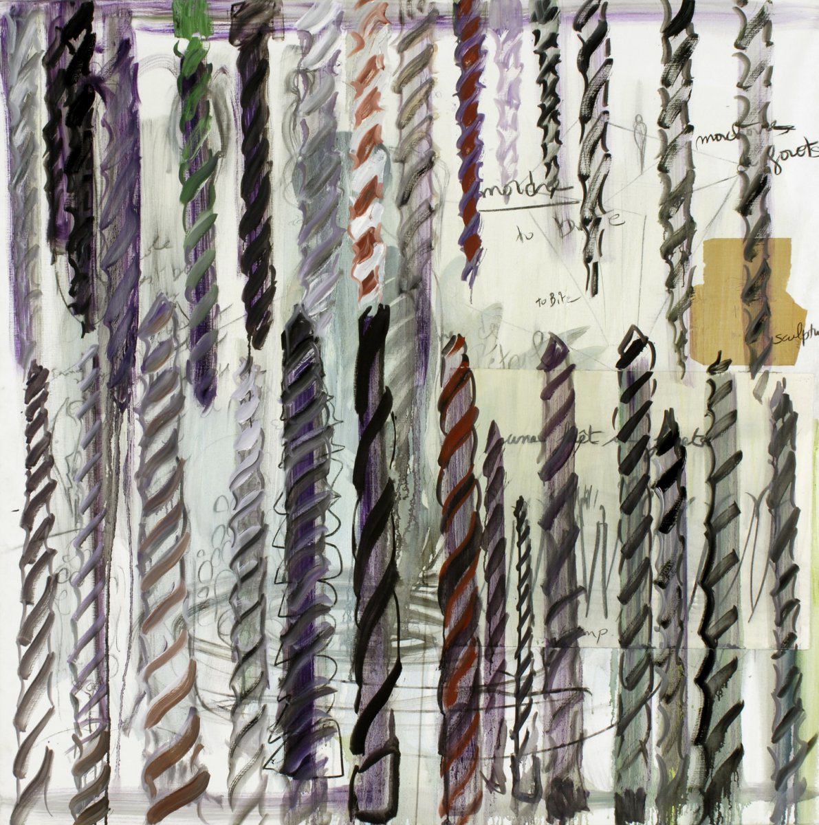 Des coups de fusain virevoltants, des flèches à double sens, des mots griffonnés à la hâte (&lquo;construit naturellement», ou «culbuto», ou encore «mer noire») parcourent la toile, donnant à cette étrange forêt déracinée des allures de ballet endiablé, emporté de manière inéluctable.