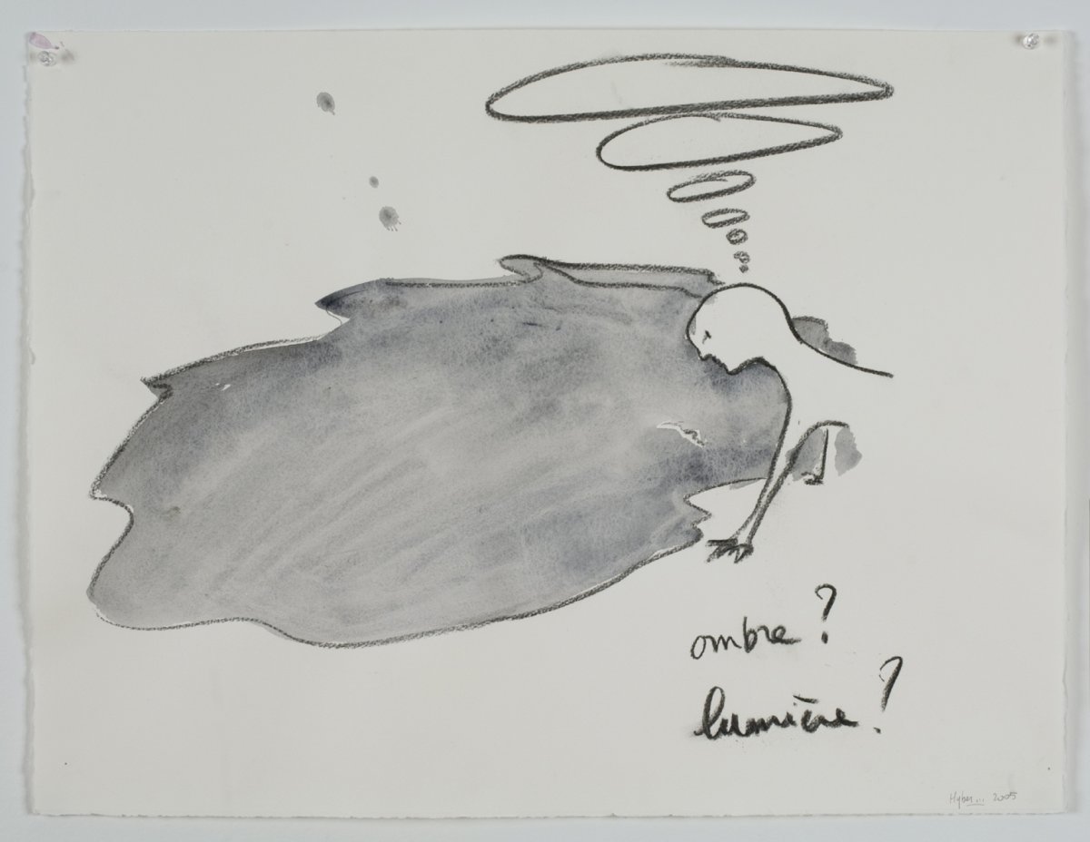 Les deux caractères du pétrole se retrouvent dans les dessins. Dans Narcisse, la silhouette minimaliste d’un homme noir se mire dans une flaque sombre avec ces interrogations: «ombre? Lumière?». Comme pour se demander ce qu’il reste aujourd’hui du mirage économique qu’a été le pétrole.