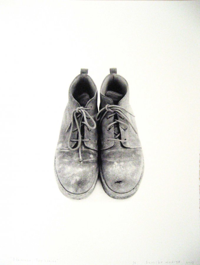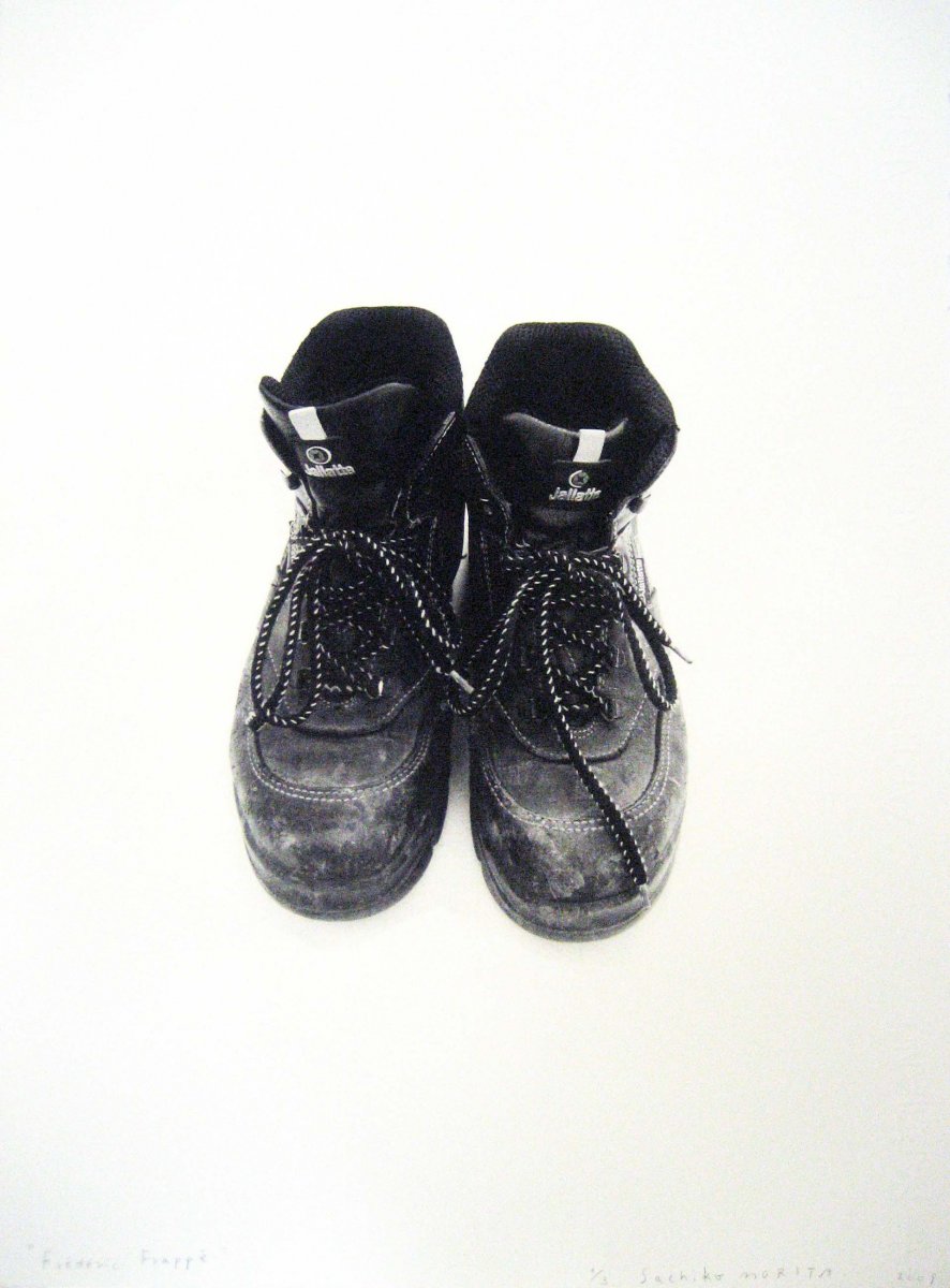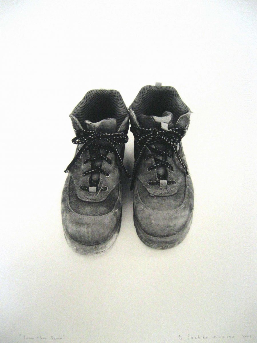 Un jour J’ai photographié une paire de mes chausseures usées, sur cette photographie j’ai trouvé la réalité accumulée que j’ai vecu vraiment.