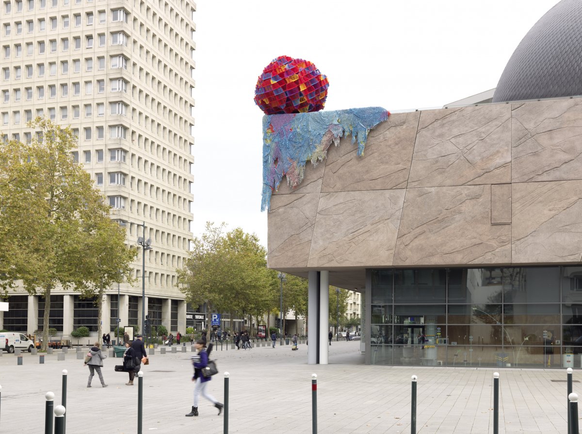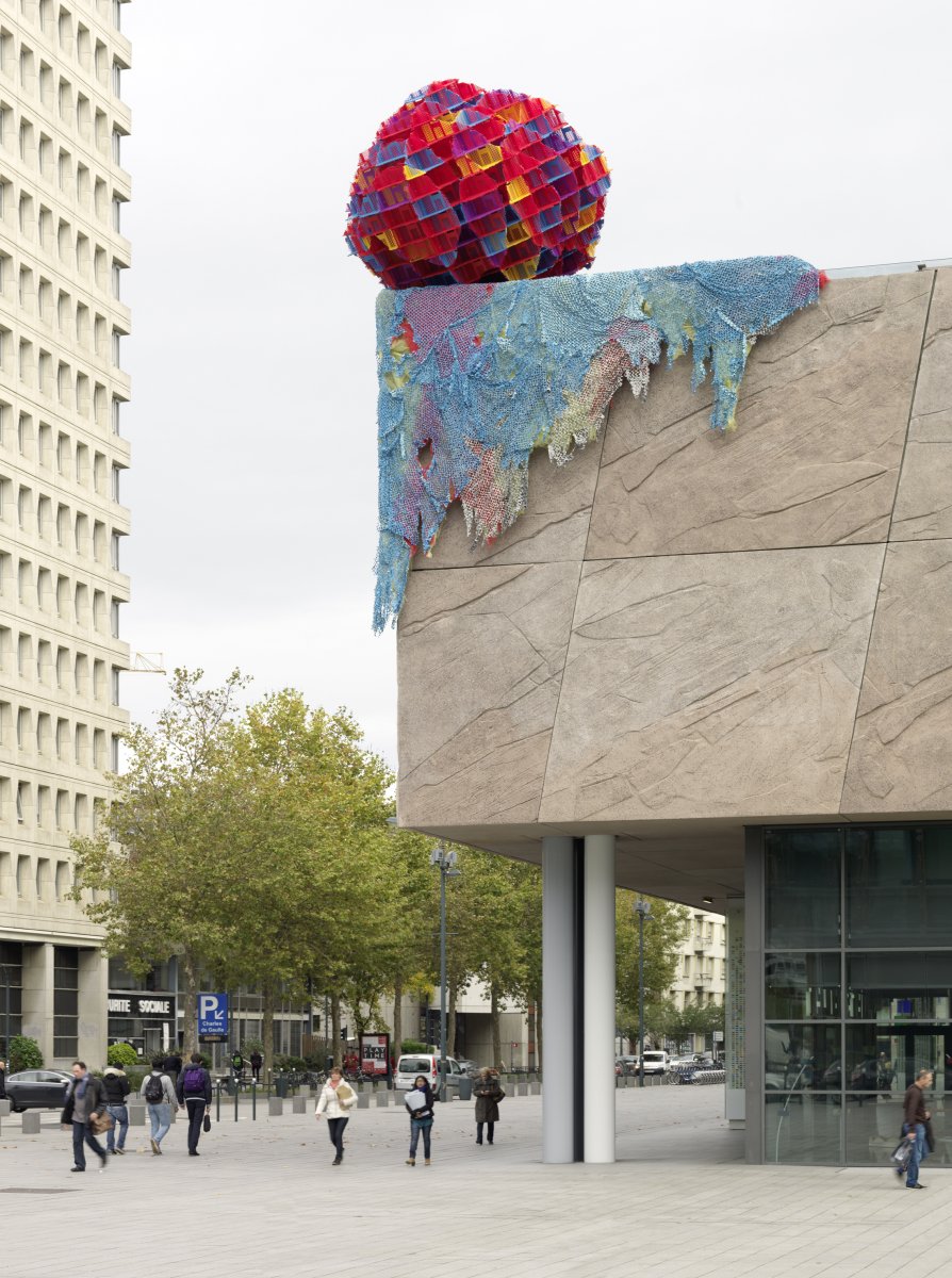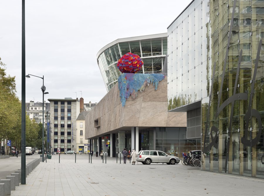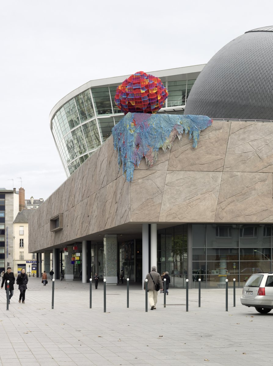 À l’initiative des Champs Libres et de 40mcube, l’artiste Vincent Mauger est invité à intervenir sur l’architecture de Christian de Portzamparc. Il y présente une œuvre monumentale qui s’agrège sur le toit du bâtiment comme une extension vacillante non identifiée.