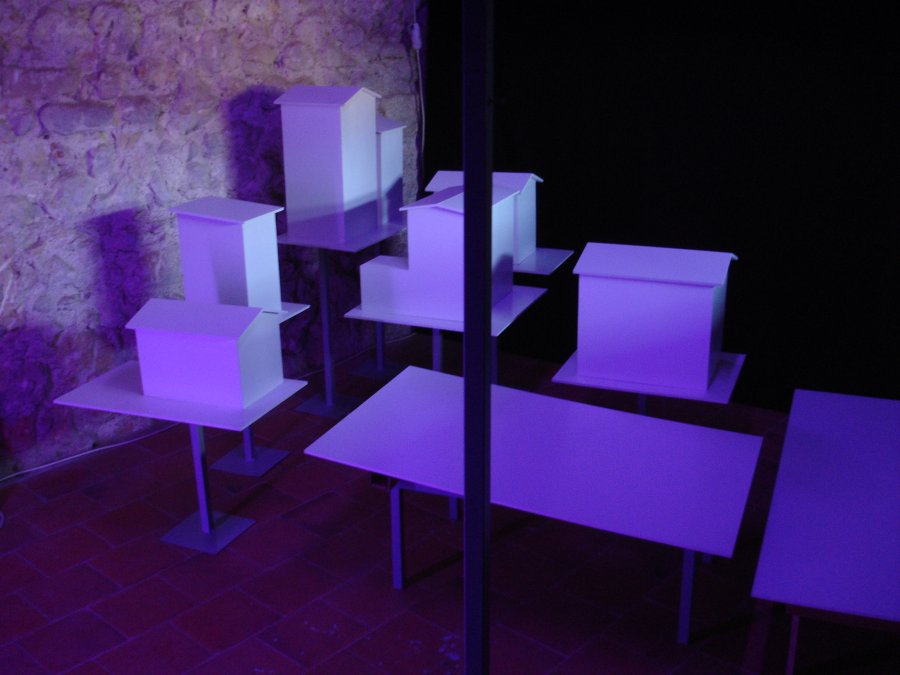 Installation dans l'octroi sud-ouest : Dibon miroir découpé, maquettes sur supports; Eclairage : fluo avec gélatine violette continue et lumière blanche sous forme d'éclair