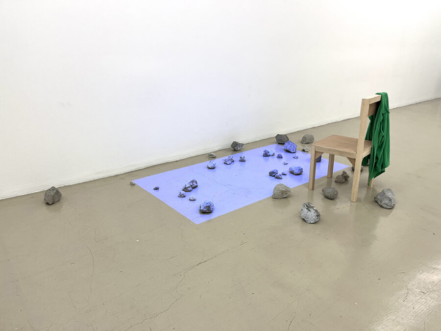 Pierres de béton, projecteur vidéo, chaise, veste vert incrustation Galerie Fernand Léger Ivry-sur-Seine