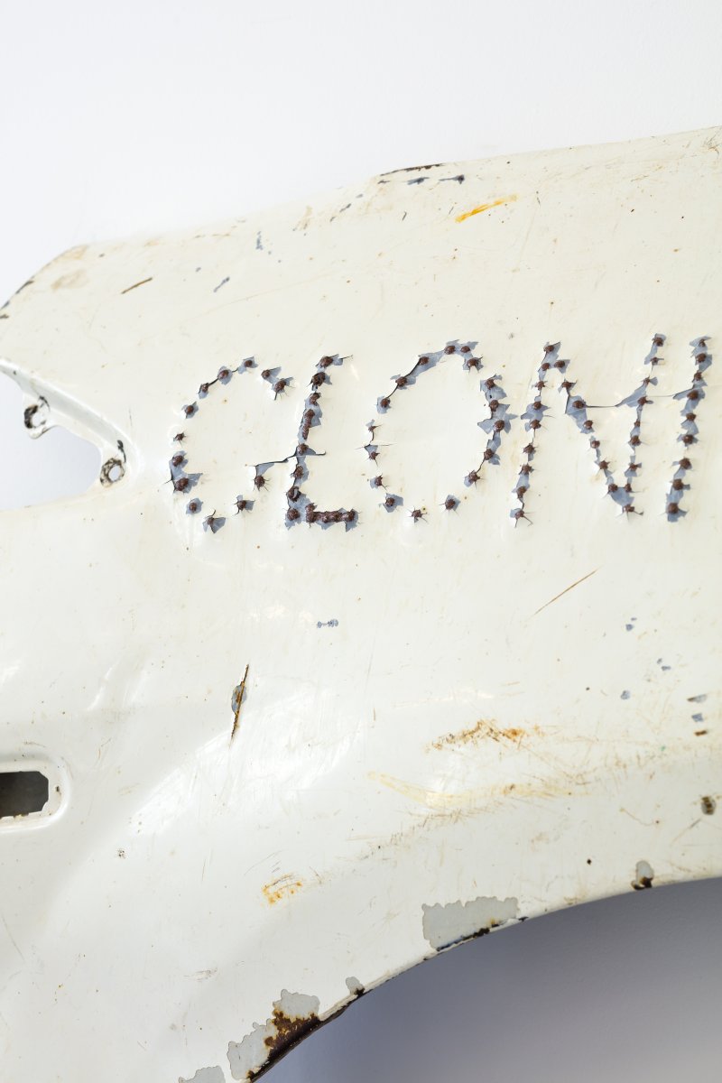 Clonisation. Sur un fragment de portière de voiture trouvé dans une décharge sauvage à Gafsa, l’artiste tatoue ce mot mal orthographié comme une marque infamante. Chaque pointillé sur ce vestige arraché est comme un clou enfoncé, un impact indélébile de la violence coloniale. La lettre oubliée ne se remarque pas immédiatement. Le souvenir de la colonisation s’impose encore trop spontanément aux esprits. Langue, coutumes, identité clonées et imprimées de force dans la peau du territoire, dans la peau de ses habitants… L’injonction, dans chaque coup, résonne : « Soyez ce que nous sommes ! »