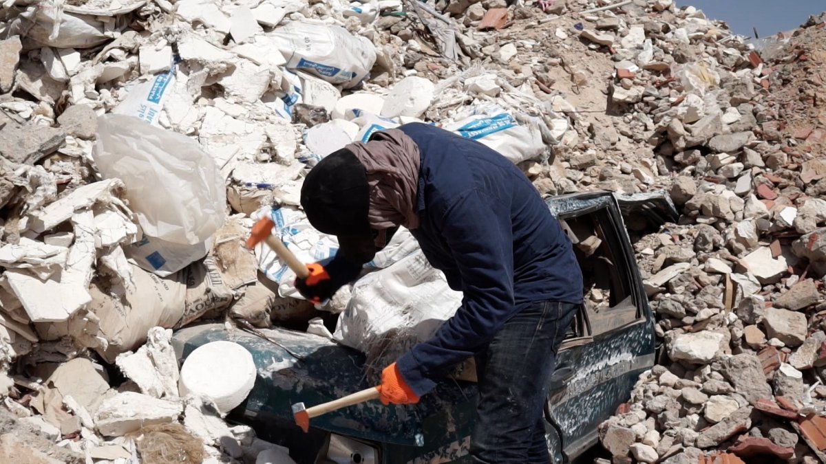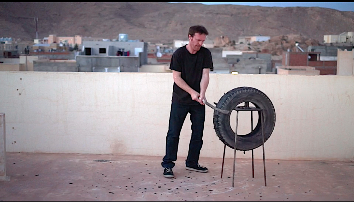 Dans les décombres d’une décharge sauvage de Gafsa, Benoît Travers martèle l’épave d’une voiture. Ses gestes se répètent dans une boucle vidéo qui ne paraît pas avoir de fin, rythmée à chaque cut par une respiration, un soupir, un regain d’énergie. Comme un mineur courbé piochant la terre pour excaver la matière, l’artiste s’acharne sur ce métal déjà miné, déjà forgé, utilisé, usé et puis jeté. Sur un rythme rapide les impacts résonnent dans l’objet autant que dans les bras de l’artiste. Les deux partis accusent les coups. L’obstination du geste entretient la lutte, la longue lutte contre l’inflexibilité, contre ce qui semble tellement plus fort, tellement plus résistant, mais qu’à force de ténacité il est possible de faire changer. Changer, et non détruire. La surface scarifiée de la voiture prend bientôt un aspect presque pictural, comme parcourue de touches de peinture du bleu du ciel.