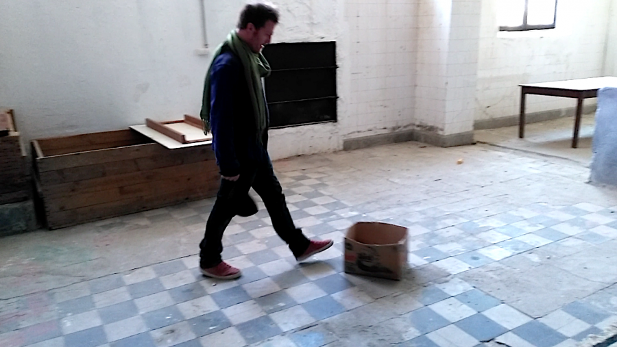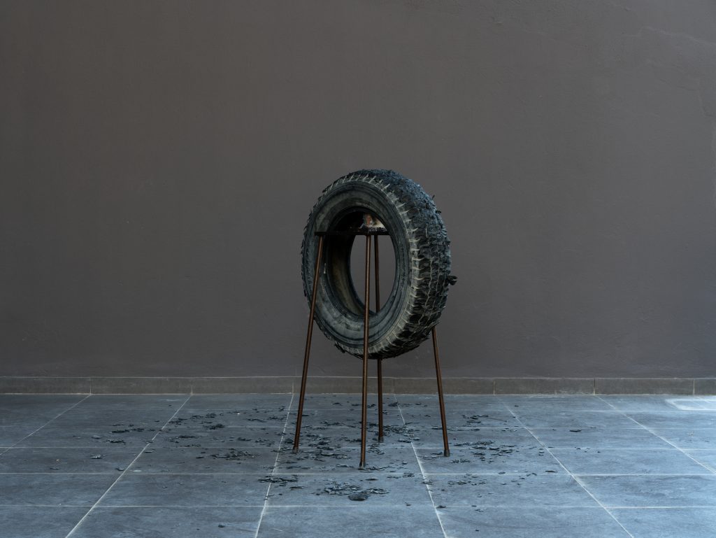 De l’air brassé au vent qui nous souffle dans le dos, on suit alors les lignes d’un câble électrique qui semble avoir été saboté. S’appuyant sur l’embrasement qui, des grèves aux électrocutions puis à l’immolation de Mohamed Bouazizi en décembre 2010, conduisit aux mouvements de révolte dans le sud de la Tunisie, Benoit Travers creuse les failles par des gestes répétés. Dans la logique de ses diverses actions et performances, il martèle de manière continue une voiture coincée sous les gravats dans le Oued asséché d’el Melah, comme pour en accélérer l’érosion ; il ébrèche à grand coup de sabre les crampons d’un pneu semblant évoquer le rocher que roule chaque jour Sisyphe jusqu’en haut d’une colline. De ces superpositions et polyrythmies, il en ressort un « dialogue sonore » rejouant l’entremêlement des rythmes percussifs produit par les ouvriers sur les chantiers. Son geste, en apparence vain et monotone, travaille les récits comme des actes, procède d’une poésie en lutte contre les destins scellés. Il incarne la capacité de remettre la croyance au service de possibilités politiques utopiques ou matérielles. Portant son attention sur des éléments saillants de l’espace urbain à Gafsa (ses briques, ses tas de pneus, ses tôles de voitures…), Benoit Travers érige les conditions d’une « architecture f(r)ictionnelle » qui façonne une partition musicale que l’on ne sait pas encore jouer. Cette dernière libère peu à peu de l’engrenage sisyphéen, des images premières, des fictions et des réalités qui empêchent de voir autrement le territoire ou d’effectuer des pas de côté. Comme le moucharabieh, son installation de briques poinçonnées produit un maillage qui accélère le vent et, dans le même temps, dérobe des regards indiscrets.