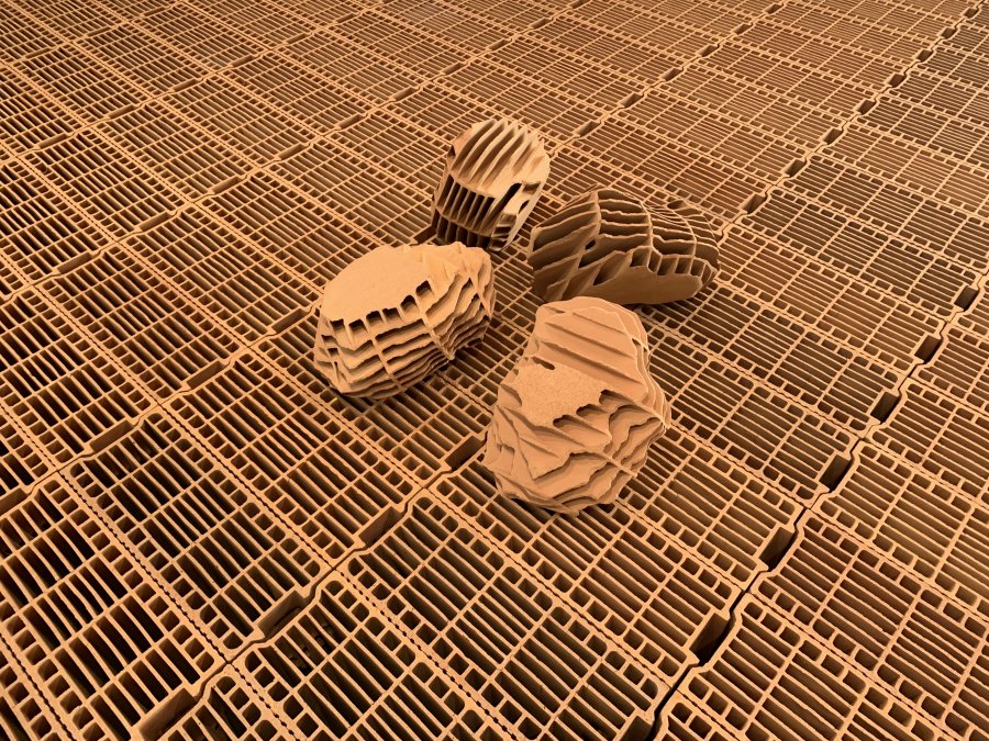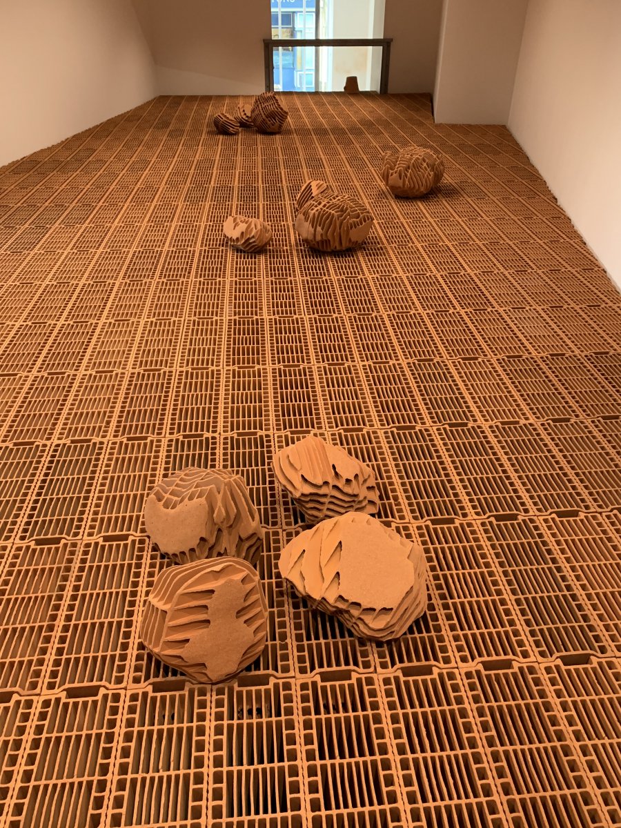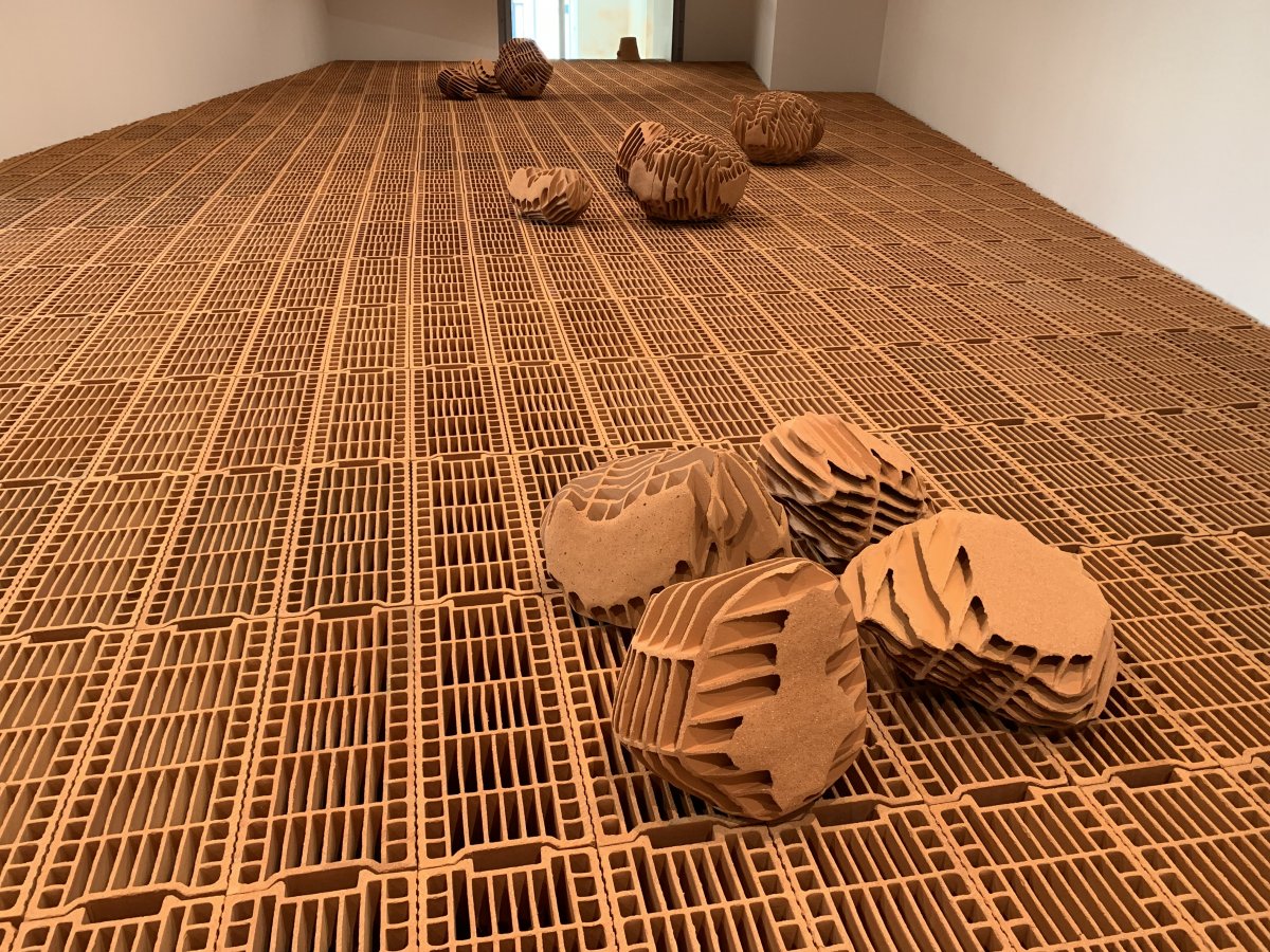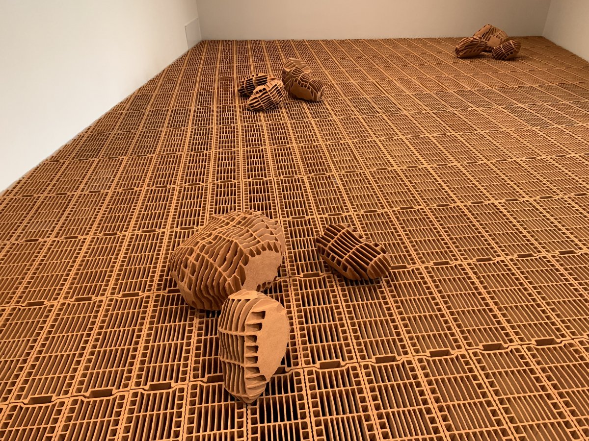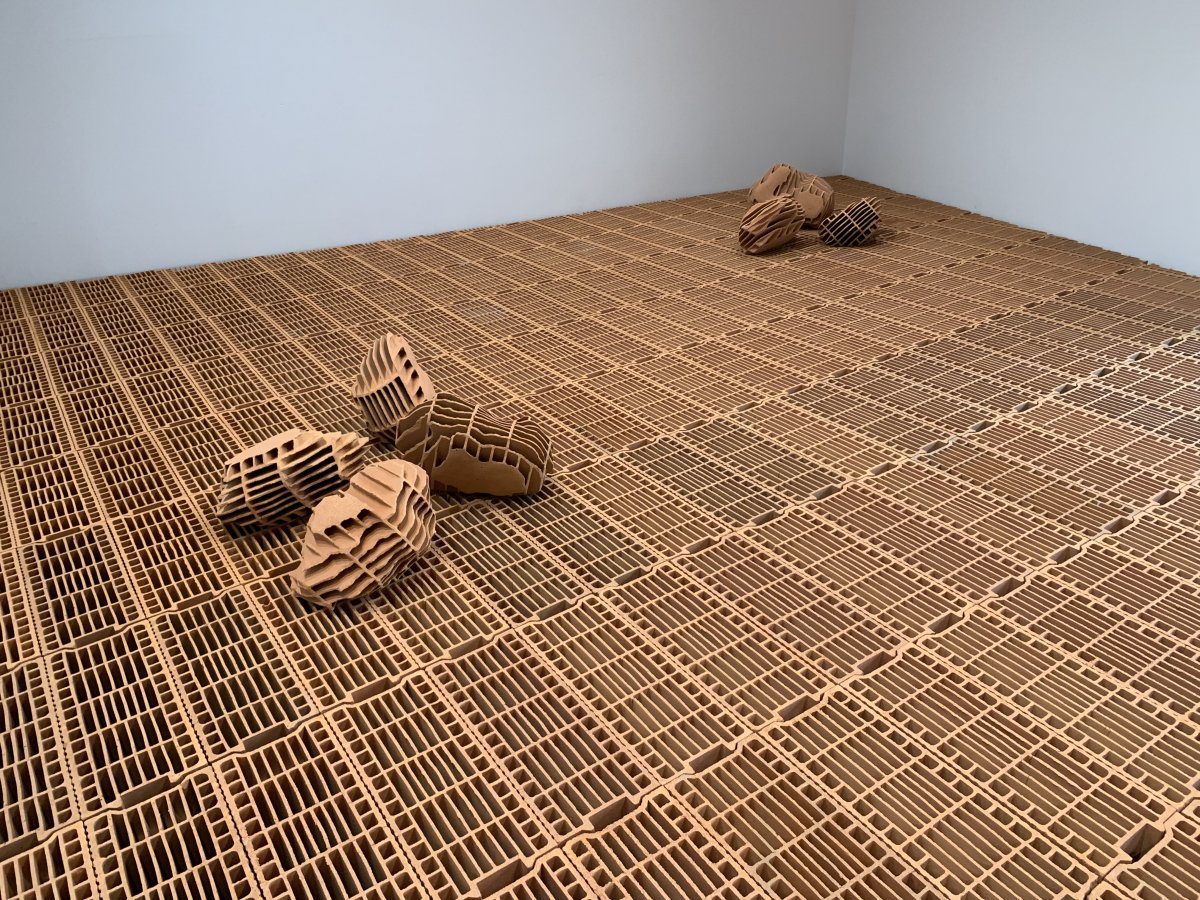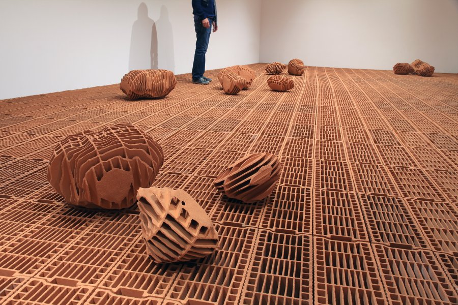 Ils ont en partage la recréation de paysages avec des matériaux et des formes simples, vernaculaires parfois, modulaires souvent. Et cette modularité contient en elle un potentiel d’expansion à l’infini. Détournant et déplaçant les usages de la terre, brique et porcelaine, les deux artistes transforment les espaces de la galerie. Ils ont en commun également de bouleverser des usages, de renverser les modalités usuelles : faire de la brique une paroi horizontale où le geste de détruire construit le paysage, faire d’un maillage de fine porcelaine un paysage d’une souplesse telle qu’elle évoque les « mappings » 3D.