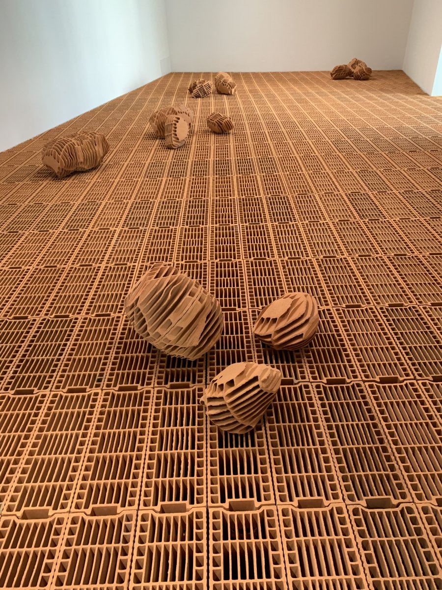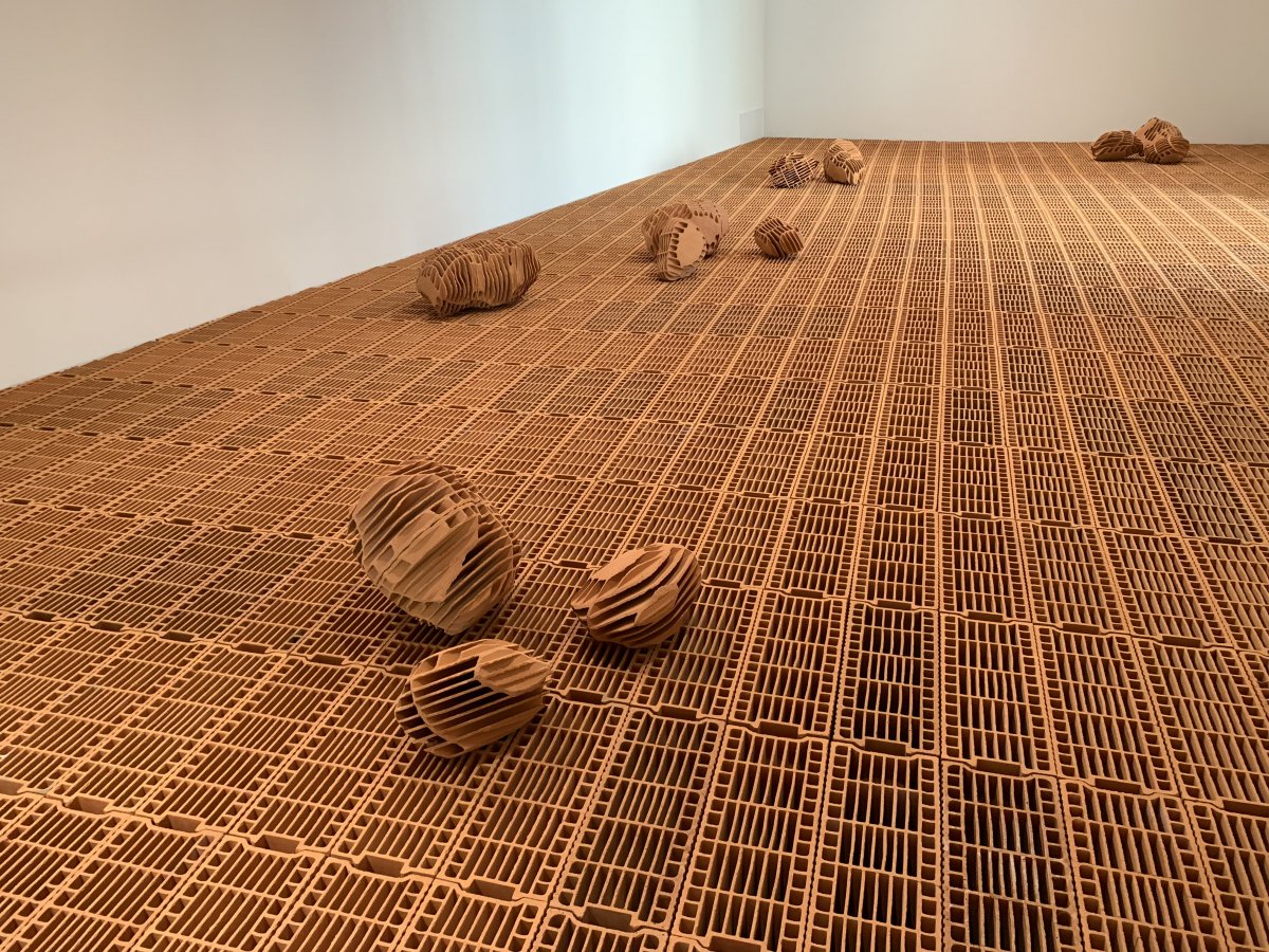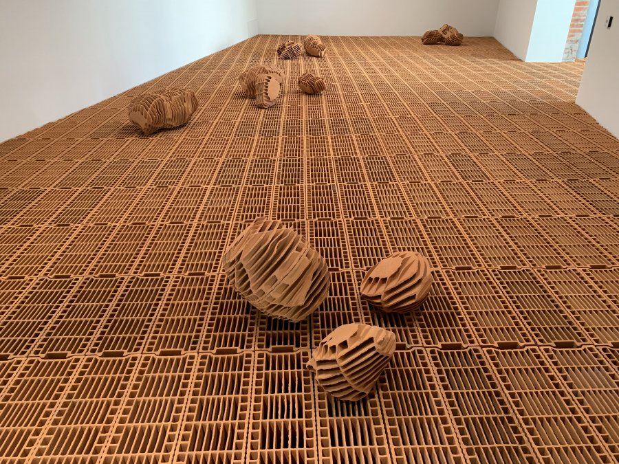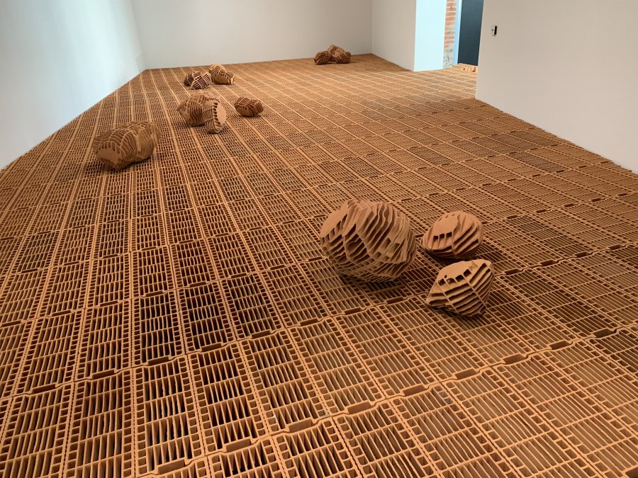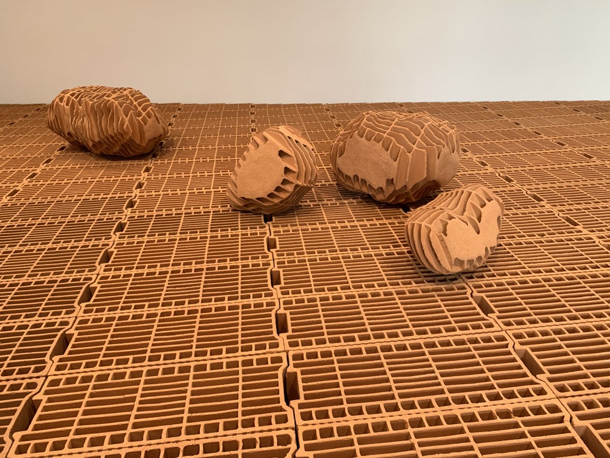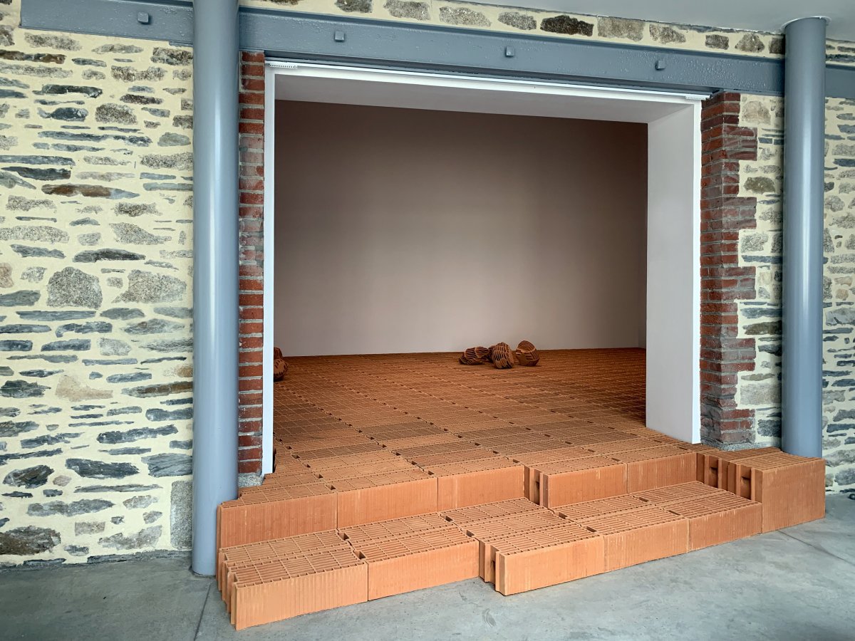 Briques posées au sol et éléments sculptés et assemblés en briques surface de 60 m² Galerie du Rohan, sur une invitation du FRAC Bretagne Landerneau commissariat Catherine Elkar
