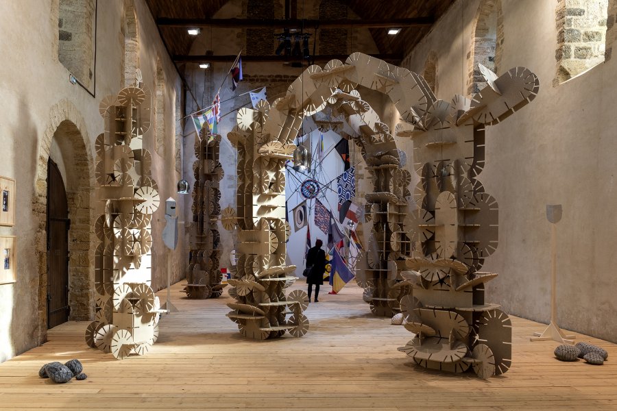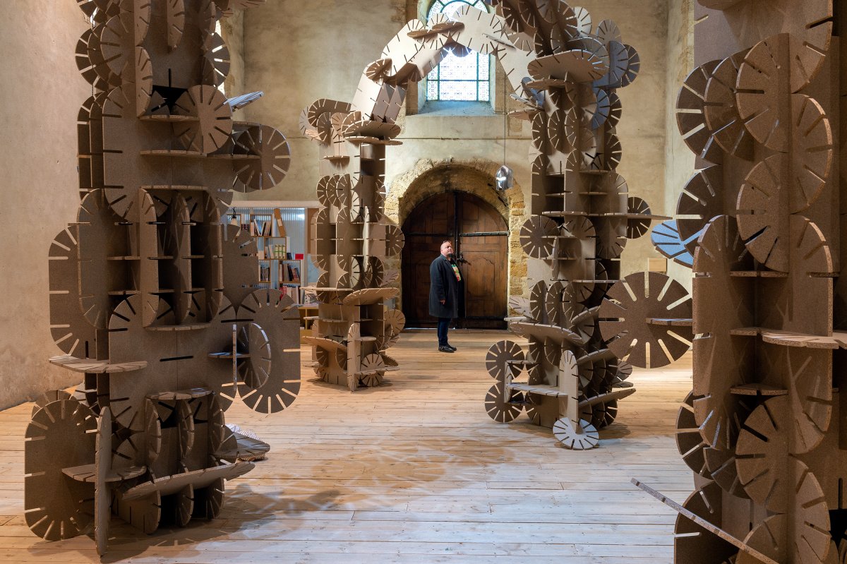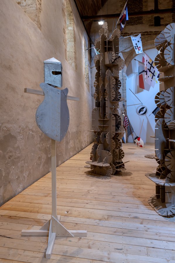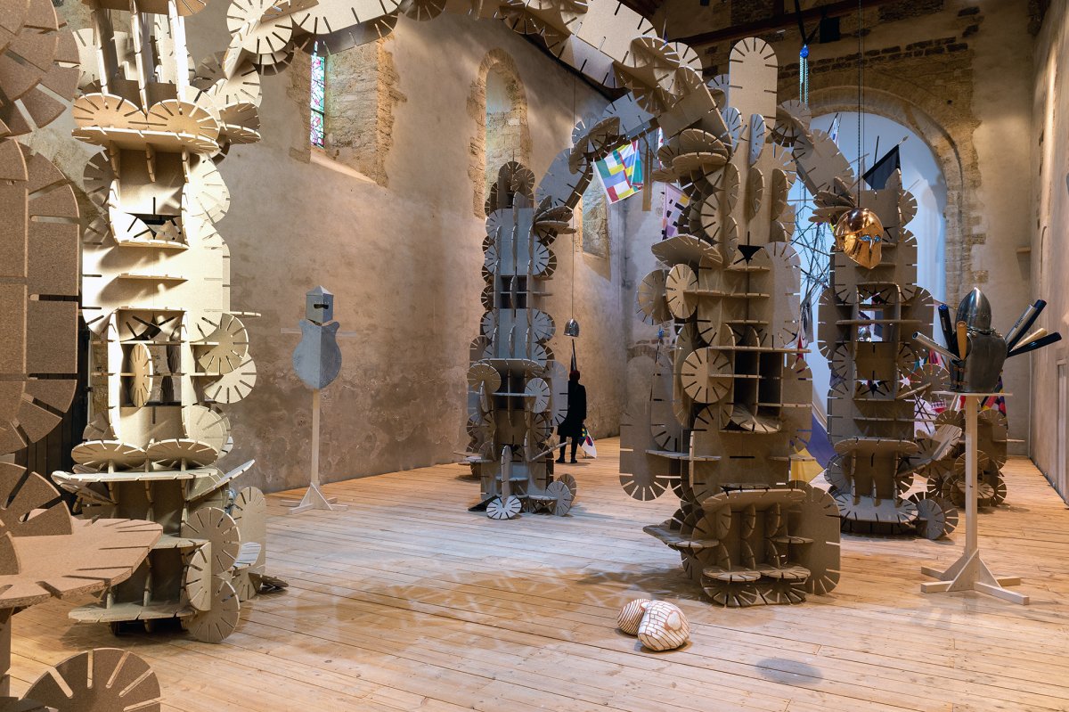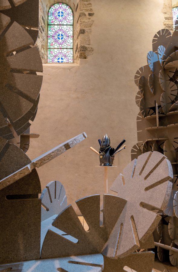 La couleur beige de ces arches et totems dialogue avec l’architecture de la chapelle du Genêteil. À la fois monumental et léger, l’ensemble invite le visiteur à pénétrer un espace scénique, une sorte de théâtre où le décor semble pouvoir évoluer et muter à tout instant, régi par une règle du jeu mystérieuse.