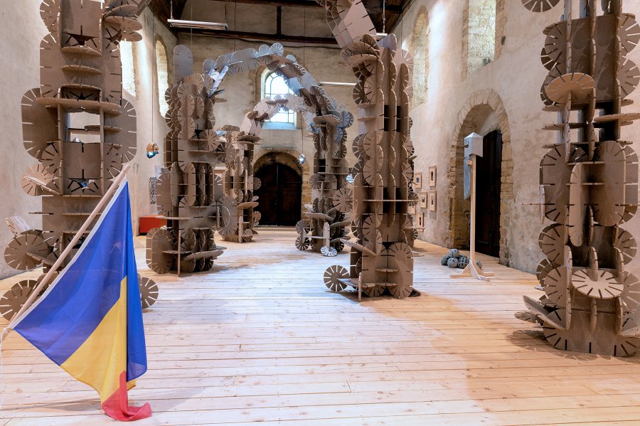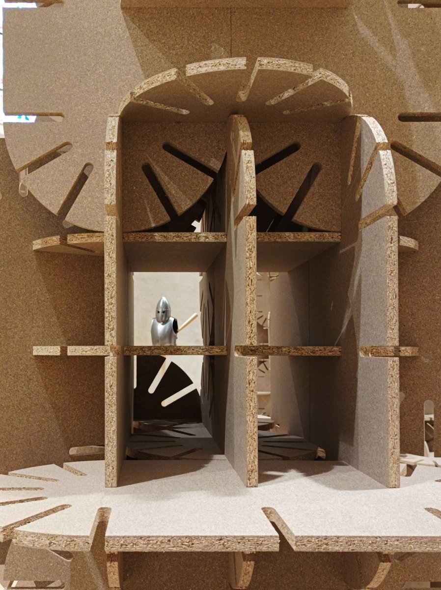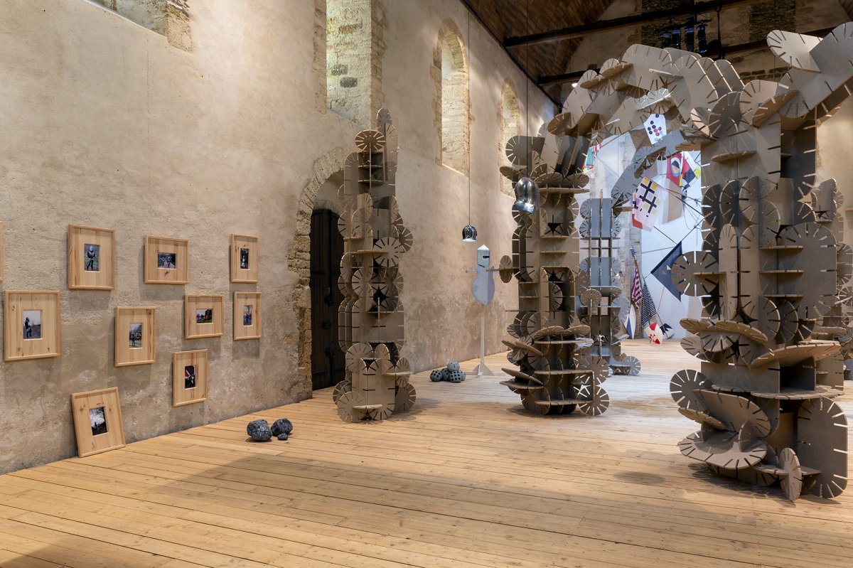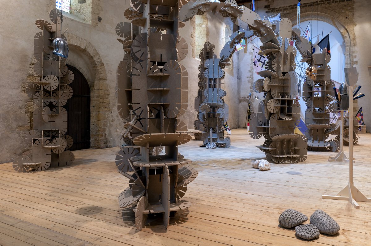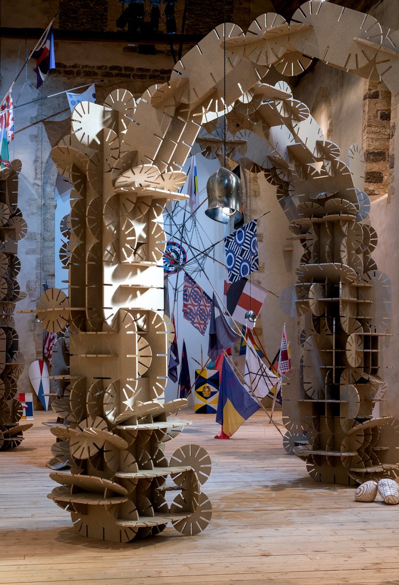 La couleur beige de ces arches et totems dialogue avec l’architecture de la chapelle du Genêteil. À la fois monumental et léger, l’ensemble invite le visiteur à pénétrer un espace scénique, une sorte de théâtre où le décor semble pouvoir évoluer et muter à tout instant, régi par une règle du jeu mystérieuse.
