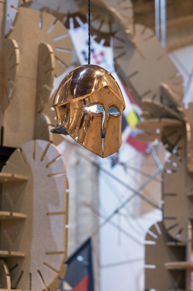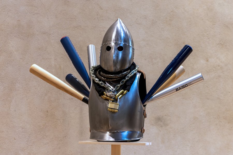 L’aspect sculptural de ces objets et leurs infinies variations chromatiques amène l’artiste à les métamorphoser en installations lumineuses, abat-jours fantastiques dispersés dans l’espace de la chapelle, têtes stylisées flottantes, ou potentiellement plus inquiétantes, décapitées. Vincent Mauger présente aussi des trophées d’un nouveau genre. Au-delà de la protection que procure l’armure, s’affirme également sa fonction de parure : c’était peut-être le dernier costume de ces combattants, qui soignaient donc son aspect. En clin d’œil à ces parures guerrières, l’artiste assemble sur socle un casque Viking, qui s’apparente à une cagoule ou un capirote3 du Ku Klux Klan, posé sur une cuirasse, et agrémenté de plusieurs chaînes et cadenas surdimensionnés, en hommage aux luxueux colliers portés par François 1er ou par les Tudor, et complété encore de bouquets de battes de baseball, surgissant des trous aménagés dans la cuirasse pour les bras. Les jeux d’associations battent leur plein : aux fastes des souverains de la Renaissance, s’allient l’imaginaire de la bataille de rue et des excès bijoutiers de certains rappeurs, qui eux-mêmes sont allés puiser des idées chez les maquereaux et les dealeurs de leur quartier, mais aussi dans l’image d’Épinal d’anciens monarques africains.