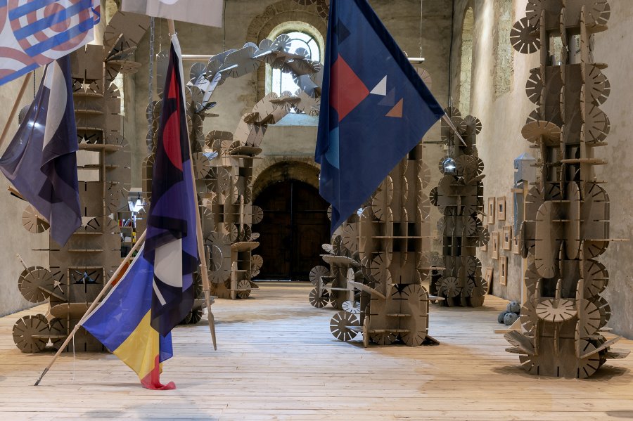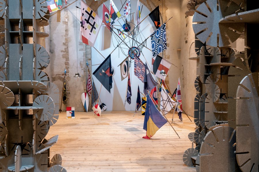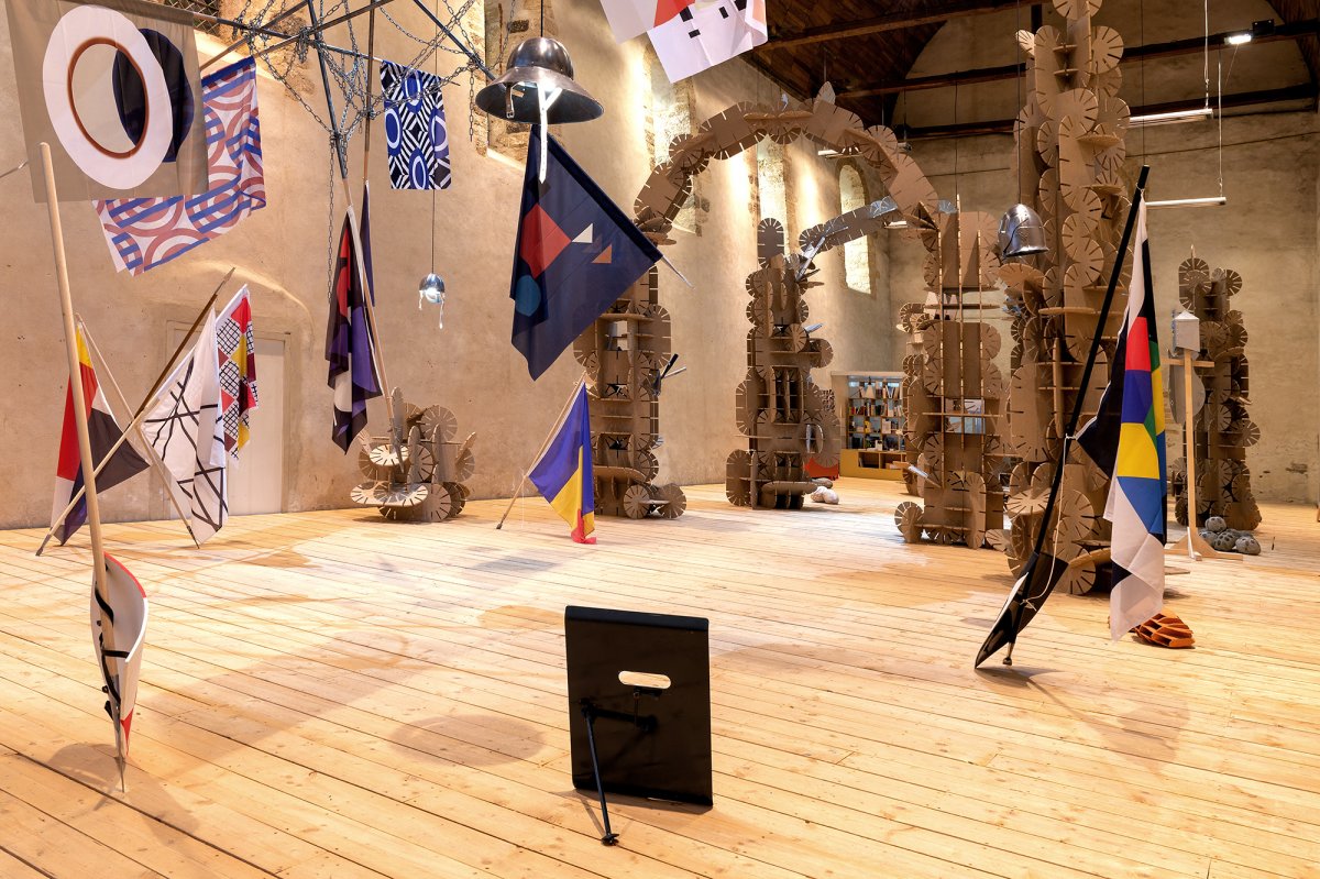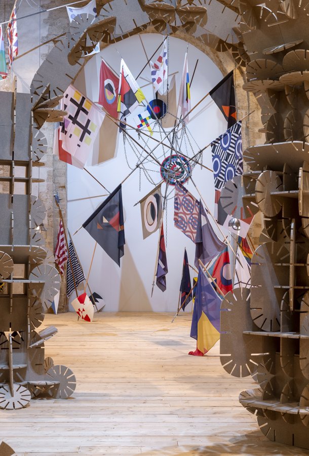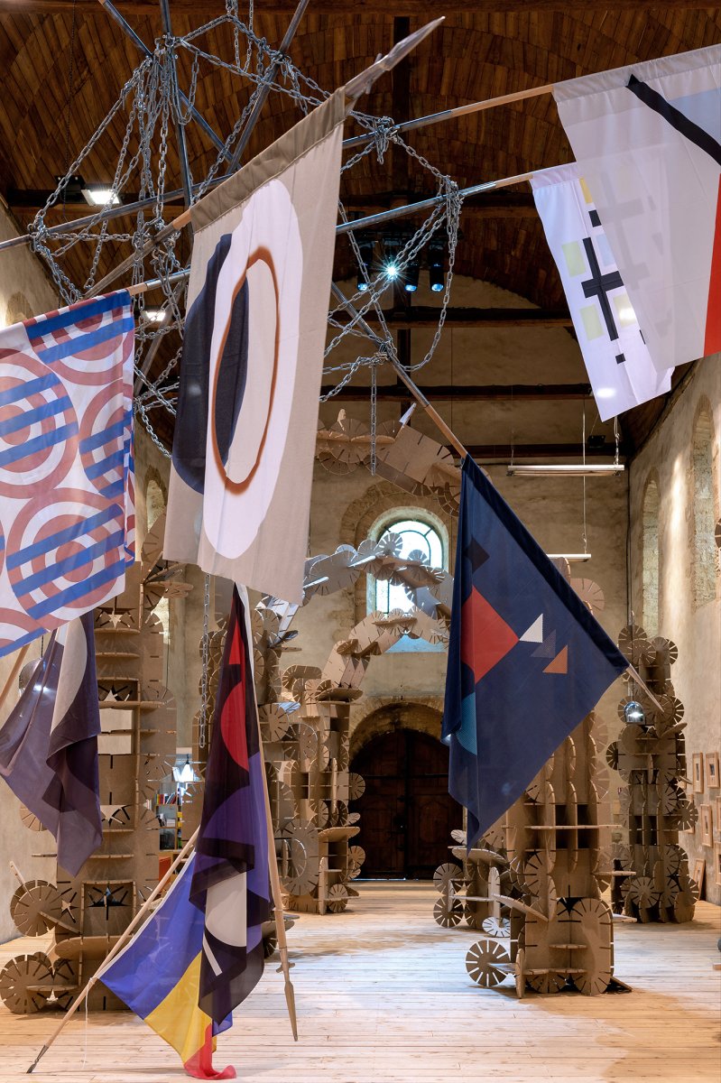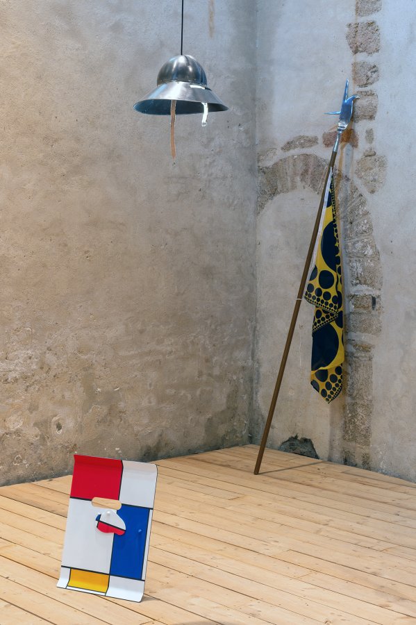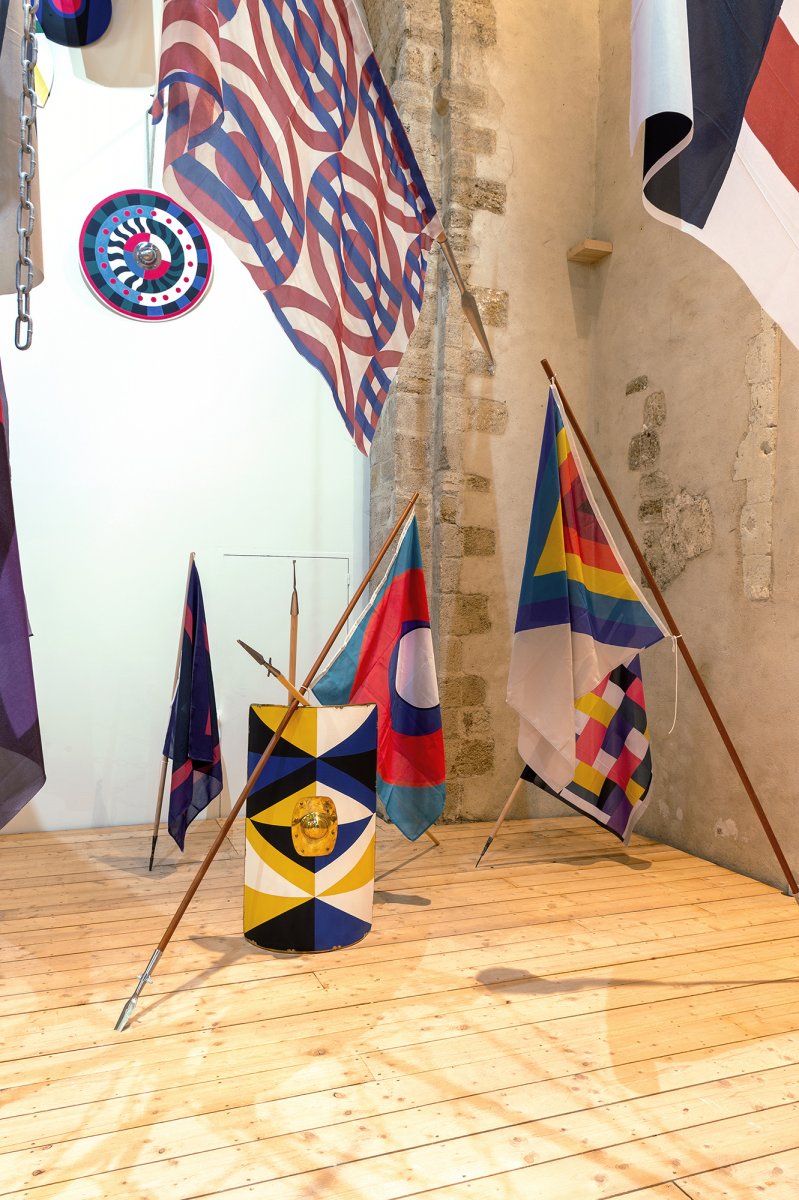 En écho, lorsqu’il met en scène le vocabulaire esthétique des artistes de l’Avant-Garde du XXe siècle, Vincent Mauger choisit des supports à la fois drôles, car anachroniques, et belliqueux : drapeaux semblables aux bannières des seigneurs, boucliers ornés, étendards propulsés par des lances qui criblent les murs de l’espace d’exposition…L’ensemble conjugue une explosion de couleurs et de motifs qui, quoiqu’unis par l’abstraction, semblent orchestrer une joyeuse cacophonie. Or que se passerait-il si on enfermait Joseph Albers, Frantisek Kupka, Mondrian, Rotchenko, Sonia Delaunay, Sophie Taeuber Arp, Theo Van Doesburg, Varvara Stepanova, François Morellet et Yayoi Kusama dans la même pièce ?