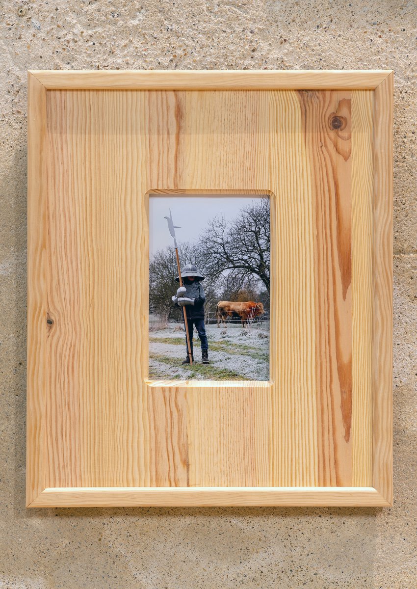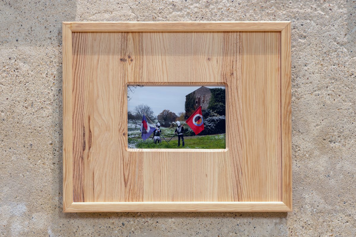 Dans l’exposition, Vincent Mauger présente une série de photos avec des enfants qui se baladent en armures de format adulte, le casque trois fois trop grand, les armes trop lourdes pour leurs frêles poignets. Ce mélange entre le côté agressif de l’équipement d’acier et les petites mains qui tiennent leurs armes en prenant des postures très sérieuses souligne l’inadéquation au cœur de l’image. Quelque chose cloche dans les proportions, jusqu’à l’encadrement de ces photographies, enserrées dans d’épais cadres en sapin, telles des Marie-Louise rustiques. En arrière-plan, le paysage, tout en brume et givre, surjoue l’atmosphère des films historiques ambiance médiéval fantastique.