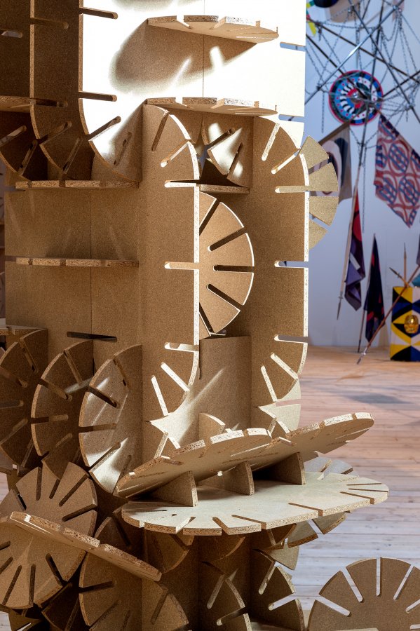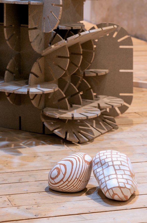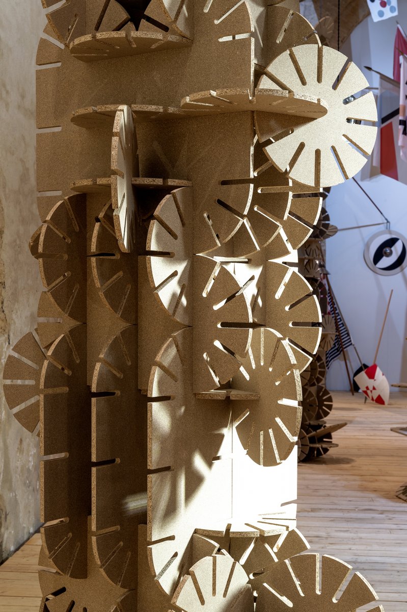 L’œuvre de Vincent Mauger propose des va-et-vient constants entre construction volumineuse (plaisir d’exploration du matériau, défi du chantier parfois monumental) et une forme de légèreté virtuelle. Dans les effusions numériques de notre ère contemporaine, il réintroduit du jeu, couplant une dimension primitive, un imaginaire artisanal à la sophistication des logiciels 3D. La série d’architectures qui traverse l’exposition confirme ce pouvoir d’hybridation : elle est composée de modules en plaques d’aggloméré découpées numériquement et assemblées par un système d’encoche1. À la vue de ces formes circulaires ou oblongues, organisées en agglomérats, plusieurs analogies surviennent : elles rappellent une flore minérale, cactus ou roses des sables, autant que certaines pièces mécaniques, des objets pensés et usinés de façon industrielle ; elles forment des arches et des colonnes plutôt instables, dont le système de construction, basé sur la multiplication et le foisonnement, permet de poursuivre mentalement la pièce, d’en imaginer les prolongements dans une dynamique de l’expansion et de l’envahissement.