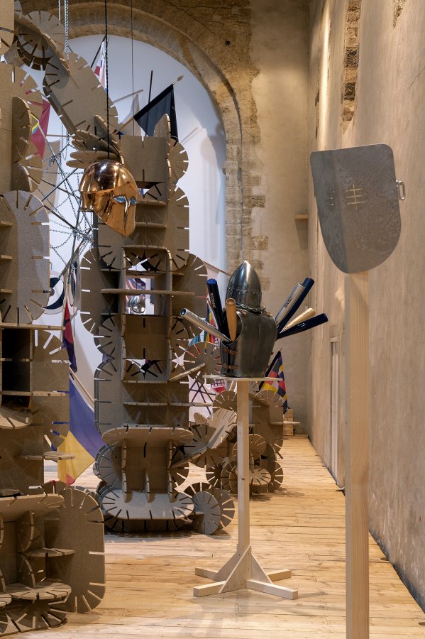 Fil rouge de cette nouvelle exposition de Vincent Mauger, l’esprit du jeu transmet déjà son énergie contagieuse au titre clamé, Querelles festives ! Ce dernier explore la figure de l’oxymore, ingénieuse alliance de mots contradictoires qui déstabilise délicatement et invite à reconsidérer notre perception habituelle des choses. Derrière ce curieux rapprochement entre le conflit et la réjouissance collective, se dévoile une exposition où la bataille est un en-jeu conceptuel, où la controverse est sérieuse autant que joyeuse. Dans cette exposition, il est aussi question du rôle de l’art, de la représentation du pouvoir, de la violence : autant de sujets contemporains dont l’analyse se renouvelle par le biais du décor, de la fiction théâtrale et du costume.