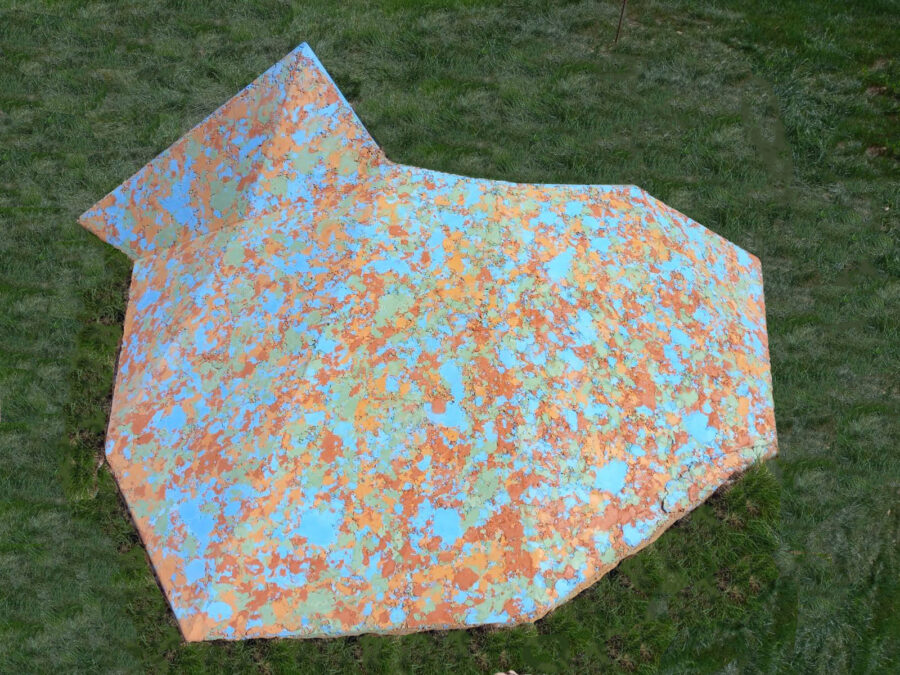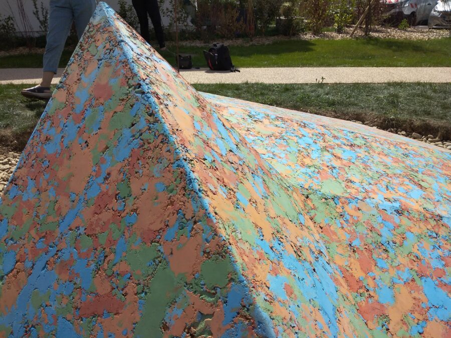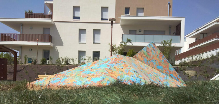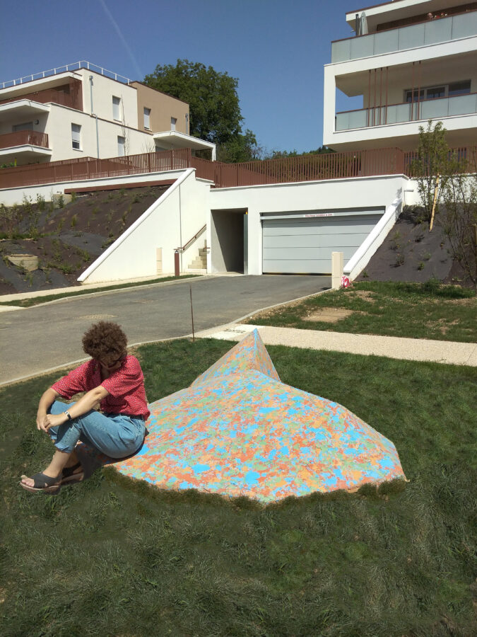 Pour le projet Confidence, le paysage est mon point de départ. Entouré de montagnes, le site offre une vue dégagée sur les reliefs alentours et les espaces boisés. Au pied du bâtiment A sur les pièces de pelouse de la façade ouest, je propose de créer une mise en abyme du paysage en en modifiant l’échelle. Je réalise donc un micro relief affleurant, jouant du mimétisme tant avec la palette chromatique des végétaux qu’avec la silhouette des montagnes avoisinantes. Surgissant de cette zone herbée, cette fausse gemme colorée est conçue pour supporter une lourde charge et pourra endosser la fonction que l’utilisateur choisira de lui donner.