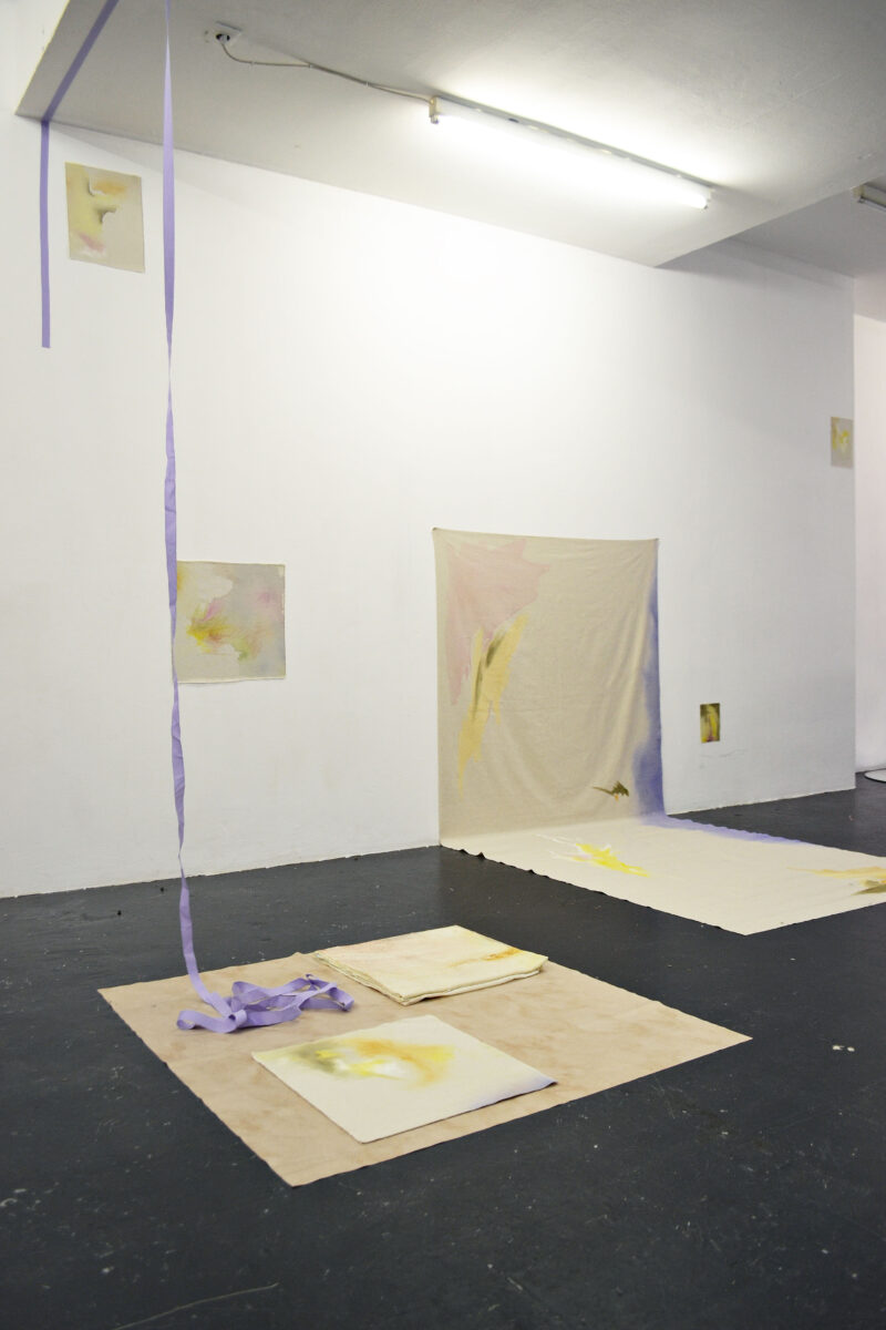 Installation, peinture acrylique, pastels, aquarelle sur divers tissus Galerie Treize Paris, France commissariat Ida Soulard