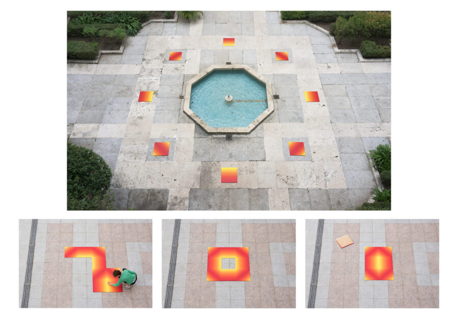 Je joue avec la forme hexagonale de la fontaine, celle ci placée au coeur des allées et venues et de mon quotidien à la Casa de Velazquez. Des modules de bois peints de 50x 50 cm aux lignes et couleurs de feu viennent l’entourer, comme une muraille ou l’aiguille du temps qui passe.