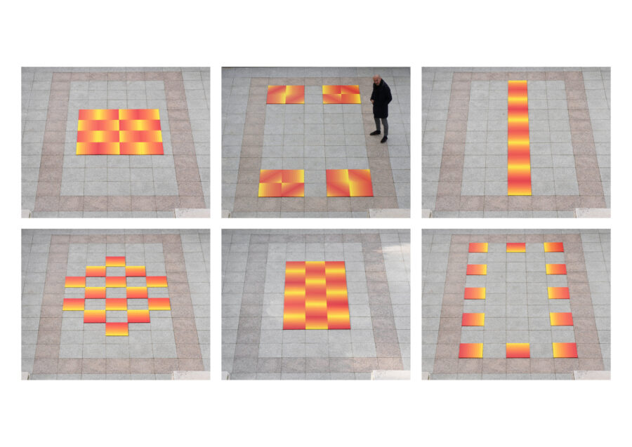 Je multiplie ensuite le nombre de modules qui, partant toujours de la forme hexagonale, viennent ensuite créer d’autres dessins au sol et au mur, d’autres variations et vibrations.