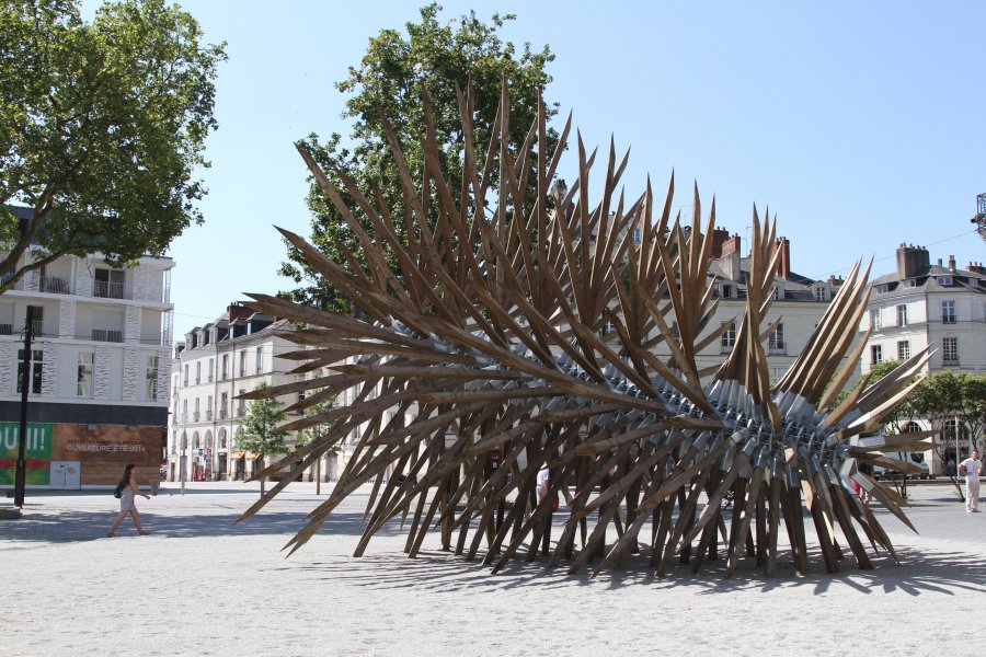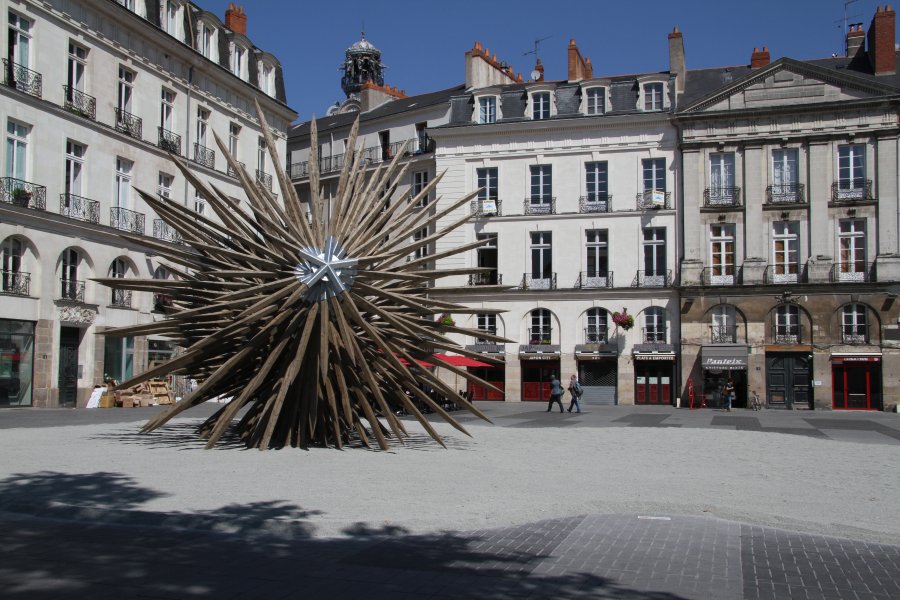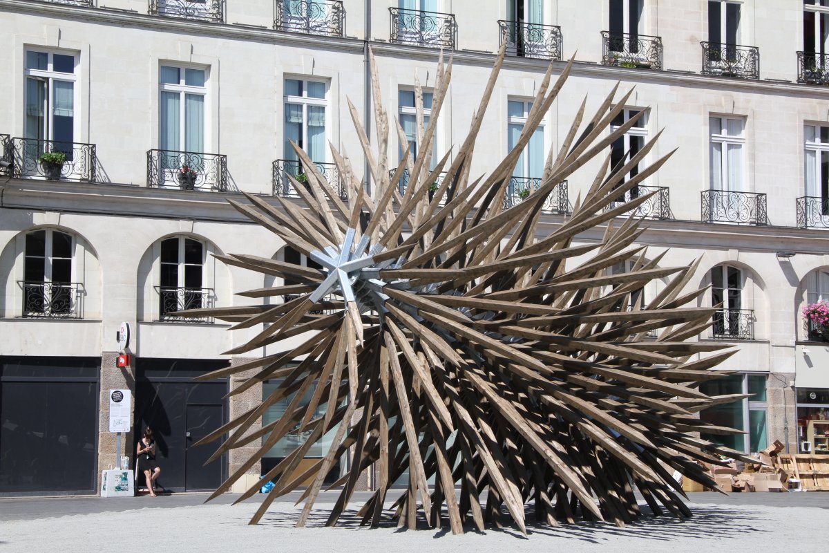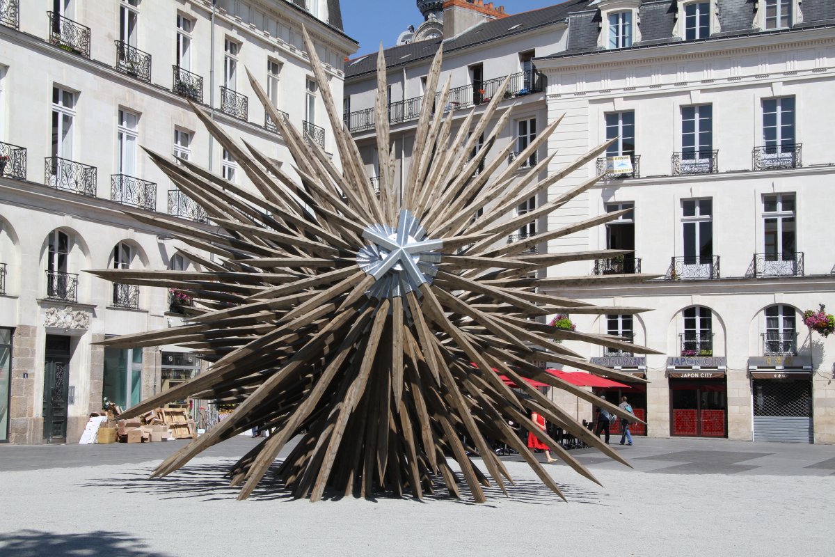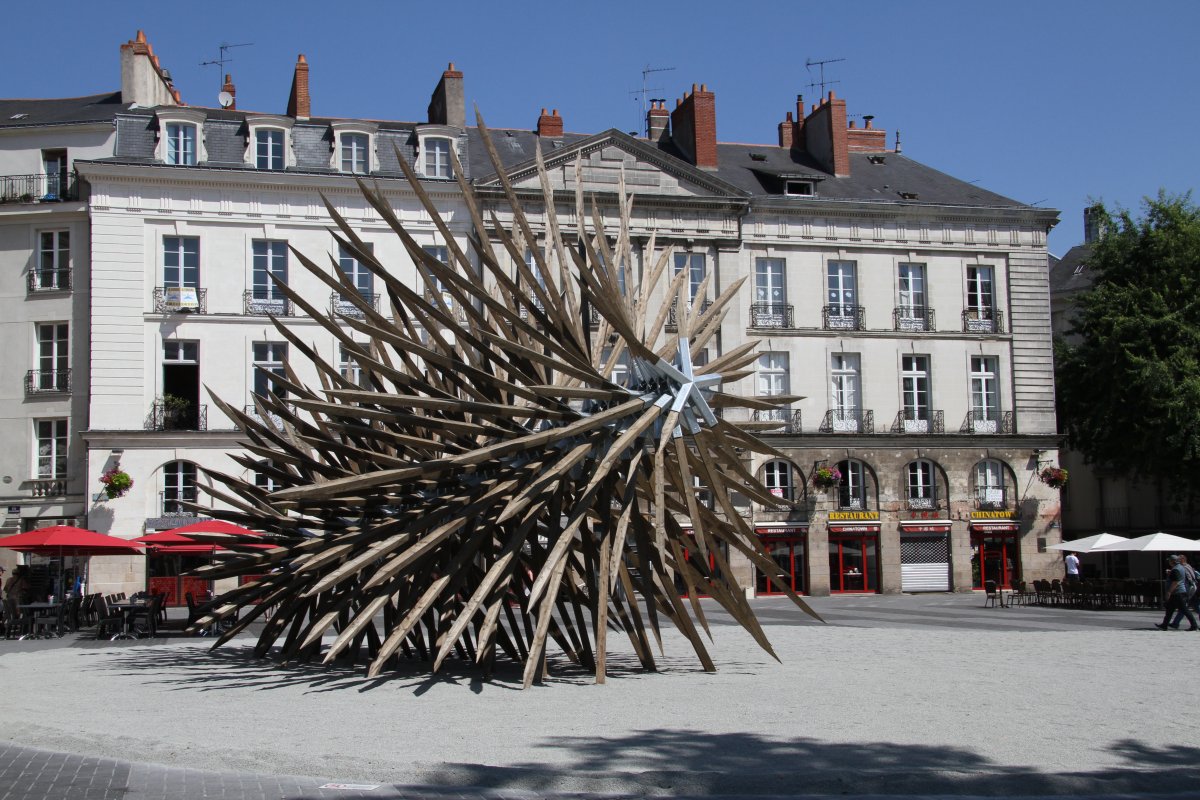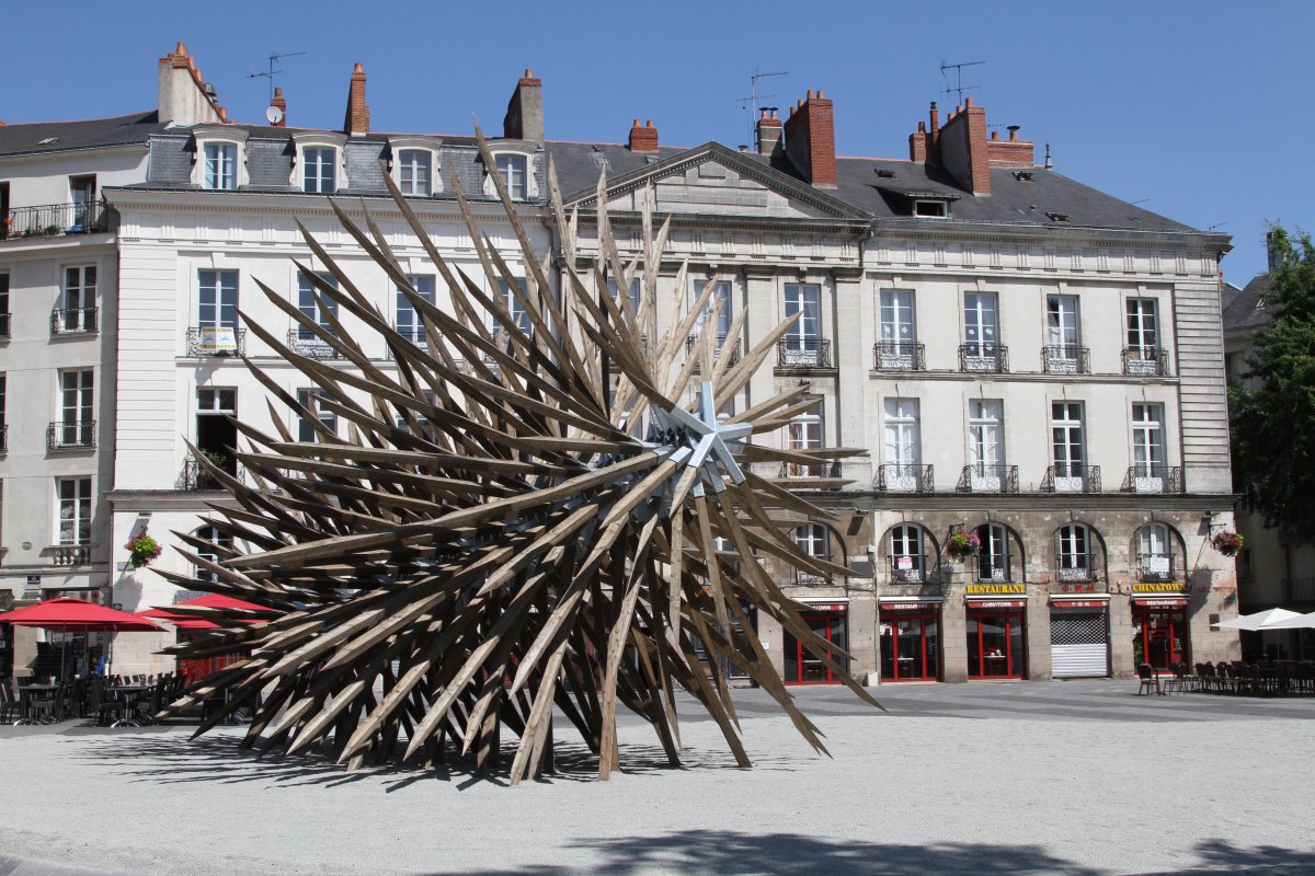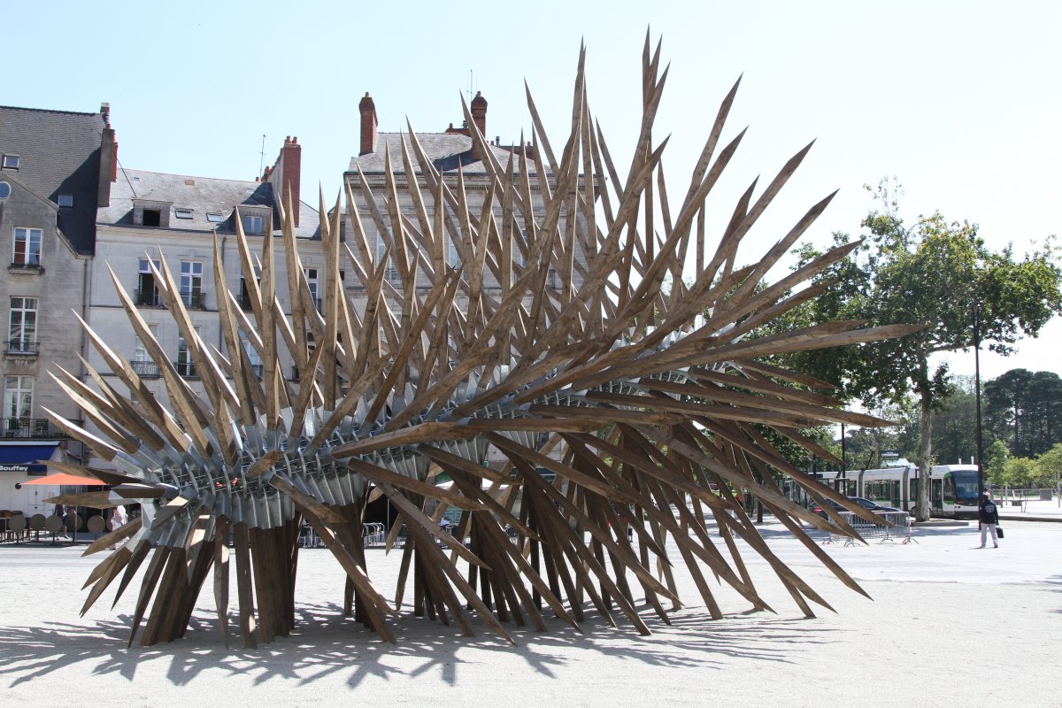 Un porc-épic aérodynamique, une massue barbare, un arbre piquant abattu par les vents ? La redoutable sculpture que le jeune Vincent Mauger a posée sur la place du Bouffay laisse libre cours à toutes les interprétations.