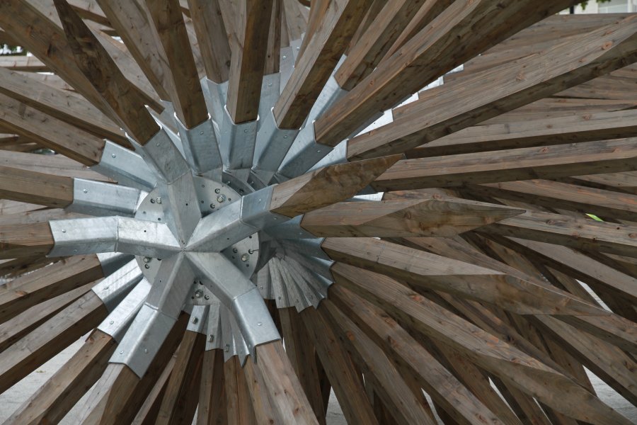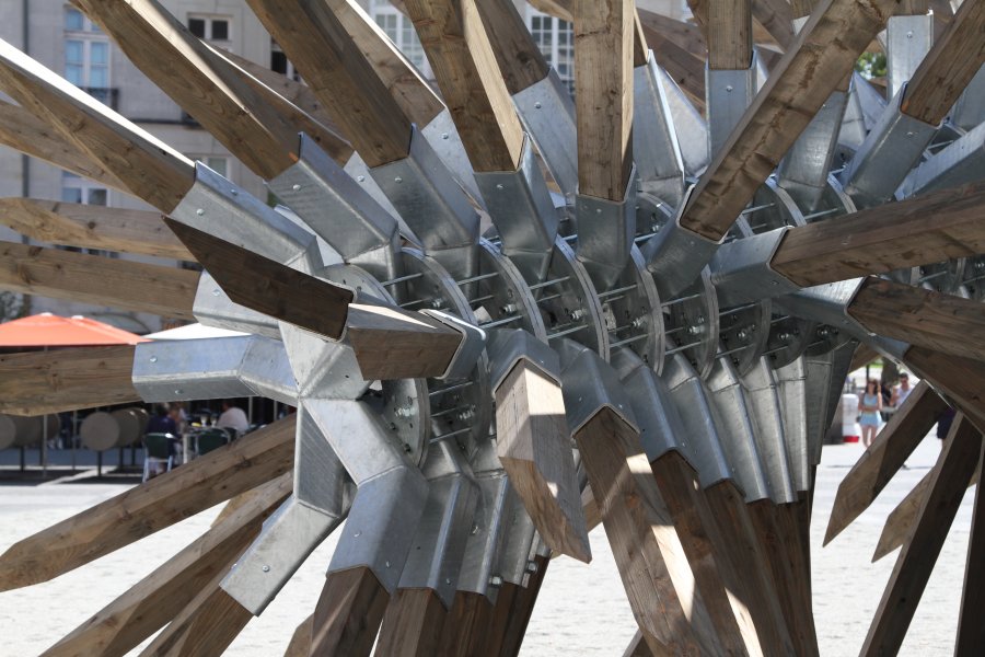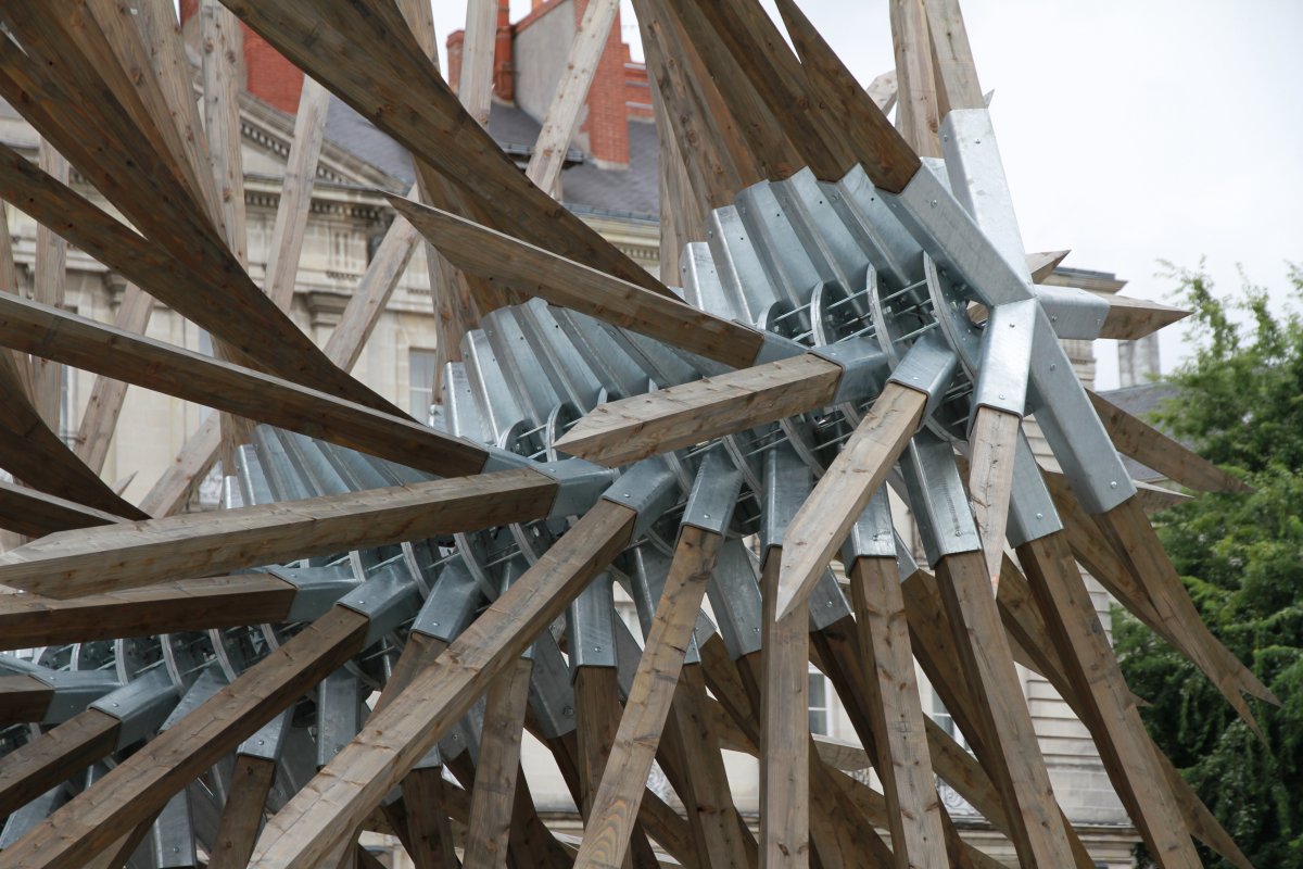 Elles évoquent la recherche d’un scientifique un peu poète, ou un éventail géant gonflé par les vents de l’estuaire. A la lumière de l’aube ou dans les feux de la nuit, selon que l’on soit patient ou pressé, l’œuvre évolue à chaque instant. D’où son titre, peut-être : Résolution des forces en présence. « Mon idée de départ a simplement été de rêver à une fabrication archaïque qui combine le bois et le métal, en un contact rustique », raconte le jeune artiste dont l’on peine à capter la voix timide, en contraste parfait avec sa pièce qui bouscule sans barguigner la ville. « Cet objet télescope différents univers : il a le caractère barbare d’une machinerie archaïque, mais peut apparaître aussi comme un arbre couché, ou un animal à l’affut. J’aime qu’on ait un rapport très physique à lui, qu’il nous domine et impose le respect. En marchant tout autour, la vision qu’on en a change : j’ai essayé de créer un véritable effet cinétique, pour qu’on ait du mal à appréhender la forme dans sa globalité ».