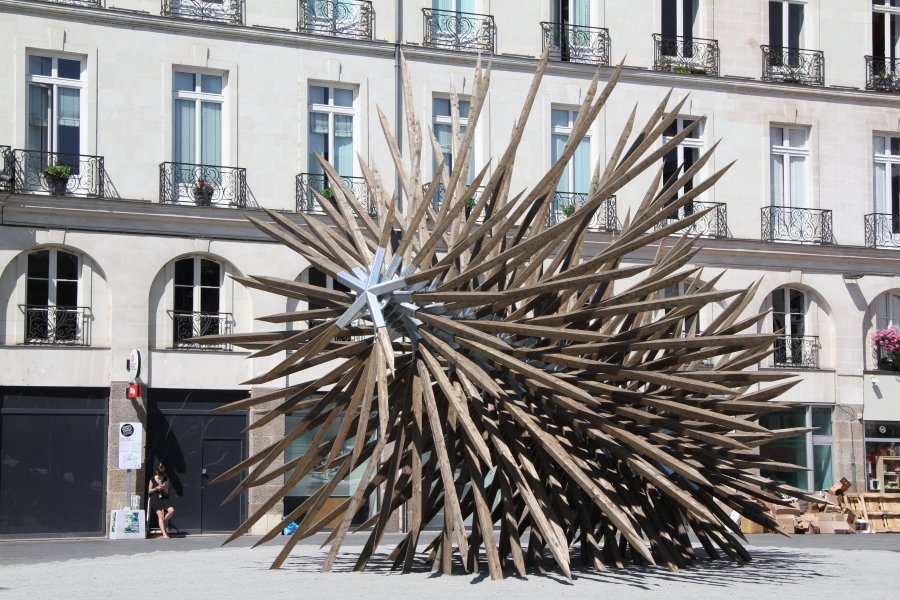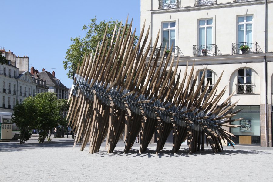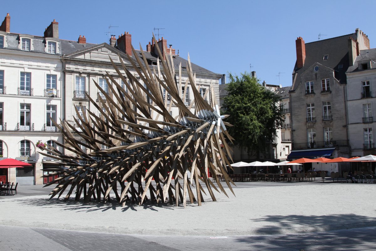 Elle est tombée comme une masse d’arme médiévale sur l’élégante place du Bouffay de Nantes : avec une grâce sans appel, tous pics dehors. L’énorme sculpture posée là par Vincent Mauger frappe d’abord par son agressivité quasi animale : autour d’une colonne vertébrale métallique prise dans un mouvement de torsion, s’hérissent de longues pales de bois à la pointe terrible. Archaïque, vraiment. Mais plus on contourne la bête, plus elle dévoile sa beauté ultra-graphique, ses jeux d’équilibre savants. Sensation d’abord d’un objet qui s’ébouriffe, clame son refus qu’on l’approche. Puis, au fur et à mesure de la déambulation autour de la magistrale ronde bosse, mille images surgissent : les lances de bois composent comme un jeu de pales d’avion, ou l’épine dorsale d’un poisson venimeux saisi dans sa course, ou encore l’envol d’oiseaux tels que les saisissait le pionnier de la chronophotographie, Edward Muybridge.