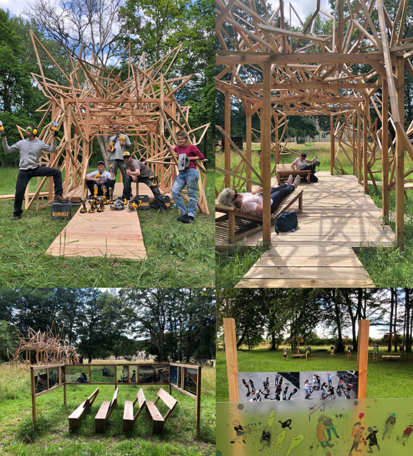 « Clairière des Collégiens », dans le cadre de «Photographie au Collège», un travail en partenariat avec 9 photographes en immersion dans 9 collèges Sarthois. Une commande du Département de la Sarthe pour l’Abbaye Royale de l’epau, de 10 structures installations photos pensées avec les élèves, et de la grande structure centrale «Rhombus Berangaria». Structure recevant le public de l’Epau, construite à partir de plus de 100 rhombes, losanges, forme présente sur la couronne de la Reine Berangère, commanditaire de l’Abbaye.