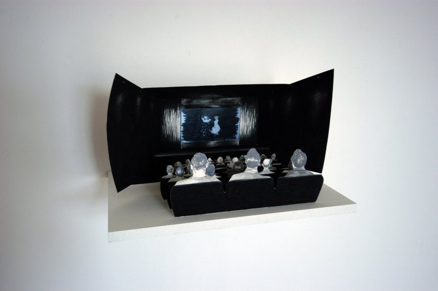Cette pièce est une installation représentant une salle de cinéma en miniature, réalisée en papier et esquissée à la pierre noire. A l’intérieur, un petit écran diffuse une animation mettant en scène Marilyn Monroe et Rita Hayworth. Cette vidéo est purement une séance de mon imagination, née d’une pensée fantasmagorique d’une scène inexistante : deux actrices se réunissant pour la première fois en pratiquant une danse d’une sensualité et d’un érotisme pur.