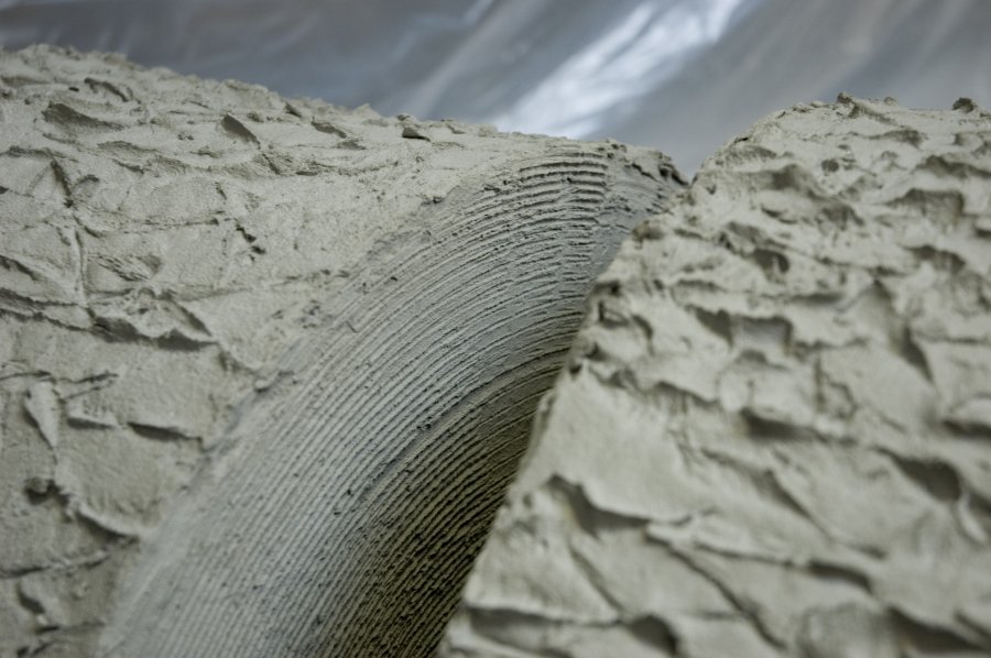 Ciment, structure en bois mousse et grillage.