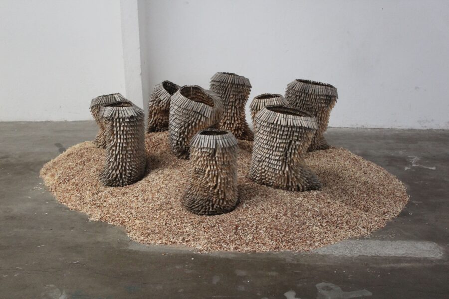 Pinces à linge en bois, dimensions variables, co-production Centre d’Art de l’Ile de Moulinsart, Fillé sur Sarthe vues de l’exposition "Pas de petites bêtes, dans ces grands bois", Ateliers de la Ville en Bois, Nantes, 2018 © Adagp, Paris, 2024
