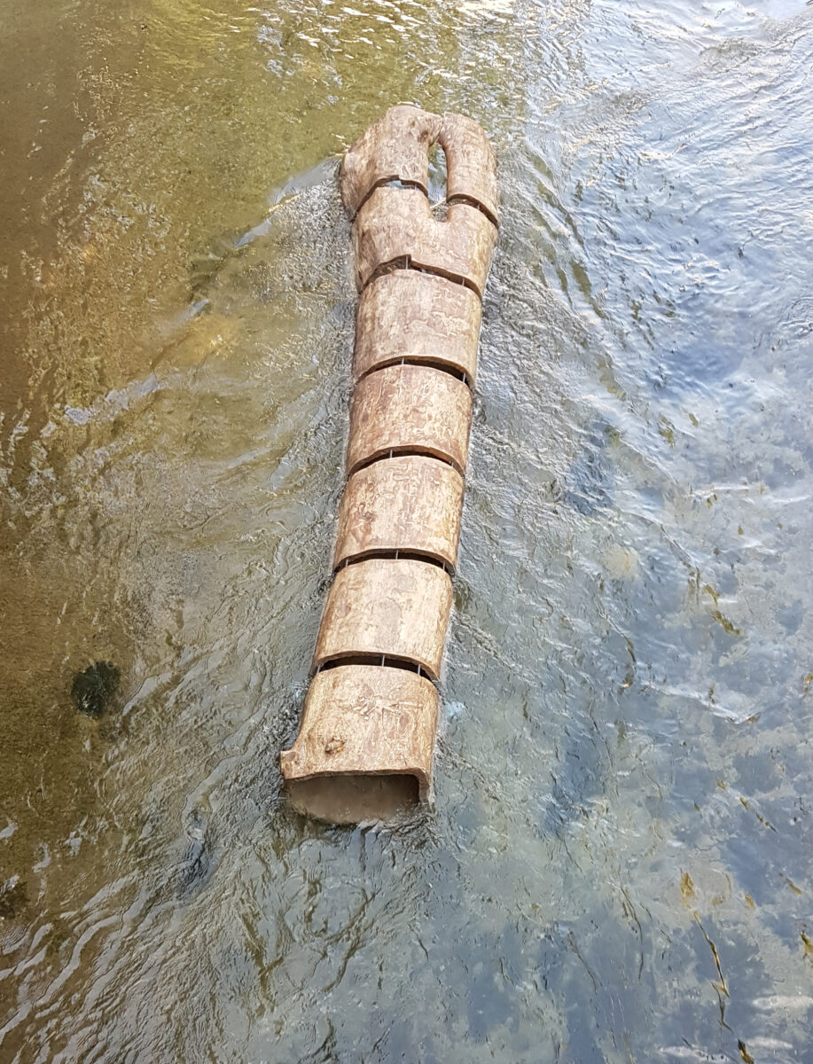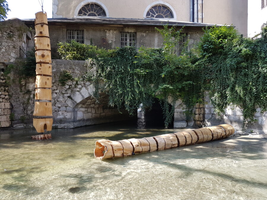 Sans Détours c’est 4 troncs segmentés et évidés placés dans l’eau dans le sens du courant. Un 5ème tronc pareillement évidé est à la verticale. Cet ensemble de sculptures forme une seule œuvre le temps d’une manifestation. Plutôt que de les confronter aux endroits prisés de la ville d’Annecy, je les ai disposé dans le canal Notre-Dame. C’est l’accord entre l’eau et les troncs ajourés dans un espace en creux qui a vocation à réguler le niveau du lac, qui donne tout son sens à cette œuvre.