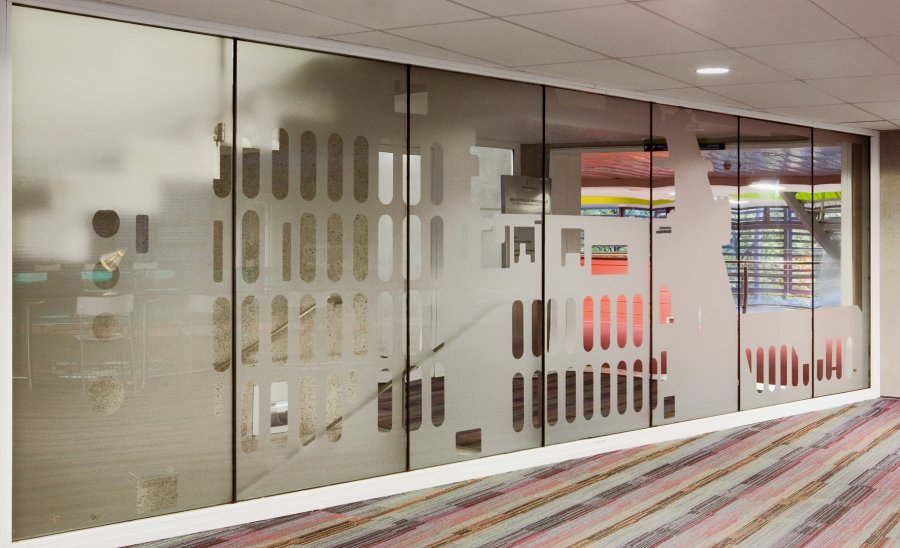 autocollants de couleur grise (trois nuances) placés sur la paroi vitrée BU de Droit Nantes Maître d'ouvrage : Ministère de Education Nationale, de l'Enseignement supérieur et de la Recherche. Architecte : Forma 6, Nantes