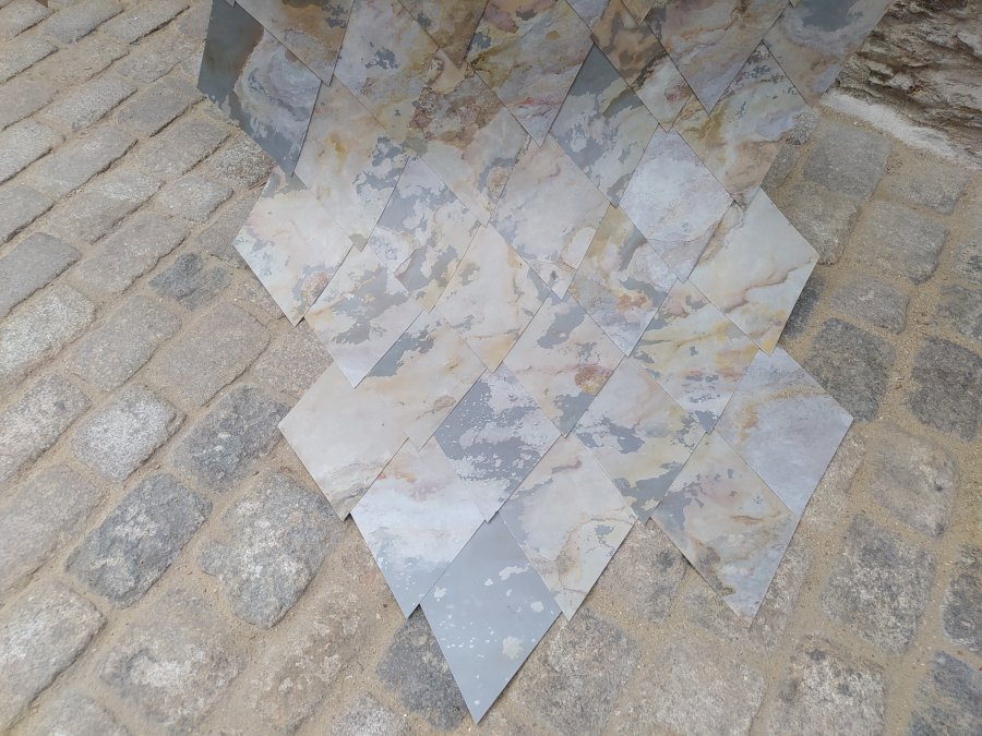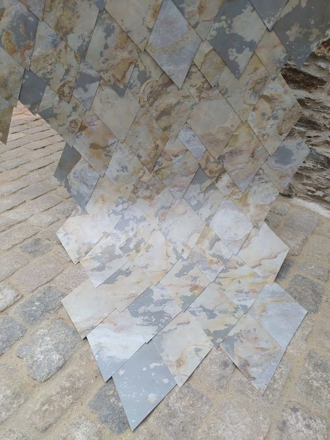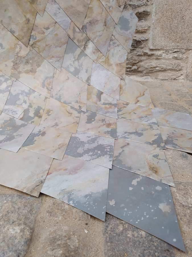 Ce drapé d’écailles de pierres en négociation avec l’espace met en abîme le support. S’agit-il de faire ou recevoir une image ? Cette sculpture se joue de l’impermanence, représente une sorte de vanité contemporaine et soulève l’ambivalence entre souplesse et autorité.