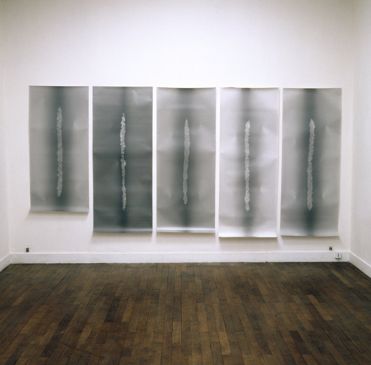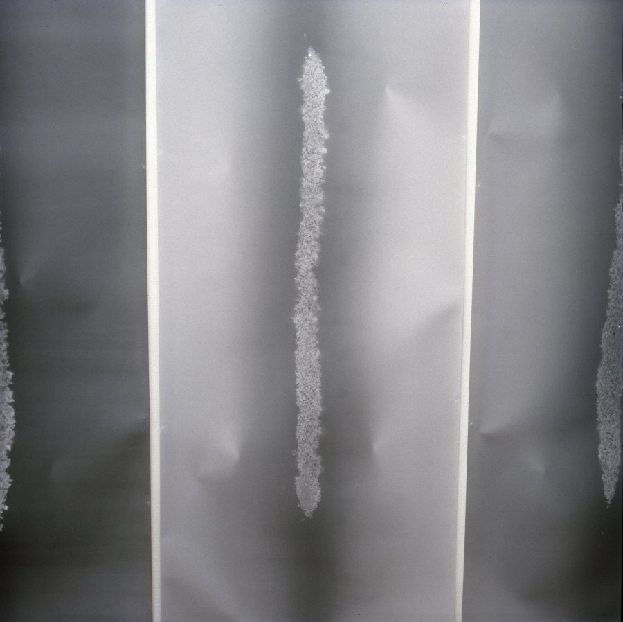 Le dispositif vaut sans doute d’être décrit : au départ le papier photographique est suspendu, éclairée au-dessous, surface sensible au-dessus. La phase finale : des éléments minéraux sont dispersé dans la goutière de papier. Qualifés de « contre-photogramme », les œuvres témoignent du contact qui s’est établi entre les éléments. Ajoutons que cette occupation progressive de la surface se déroule en dehors de tout regard, donc de toute reconnaissance, et nous frolons ce qu’il y a de fascination dans cette sorte d’inconscience matériologique qui se développe, provoquant heurts ou liaisons contre-nature. Laurent Moriceau évoque un « devenir-minéral » du papier et un devenir-papier » du minéral, non sans certaine perversité, et un goût affirmé pour ce qu’il nomme « un fantasme d’absolu » révélé par ces croisements illicites, d’une lenteur inquiétante, à peine visibles. De quoi gêner tout effort d’interprétation.