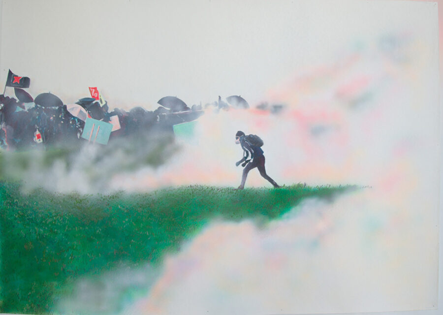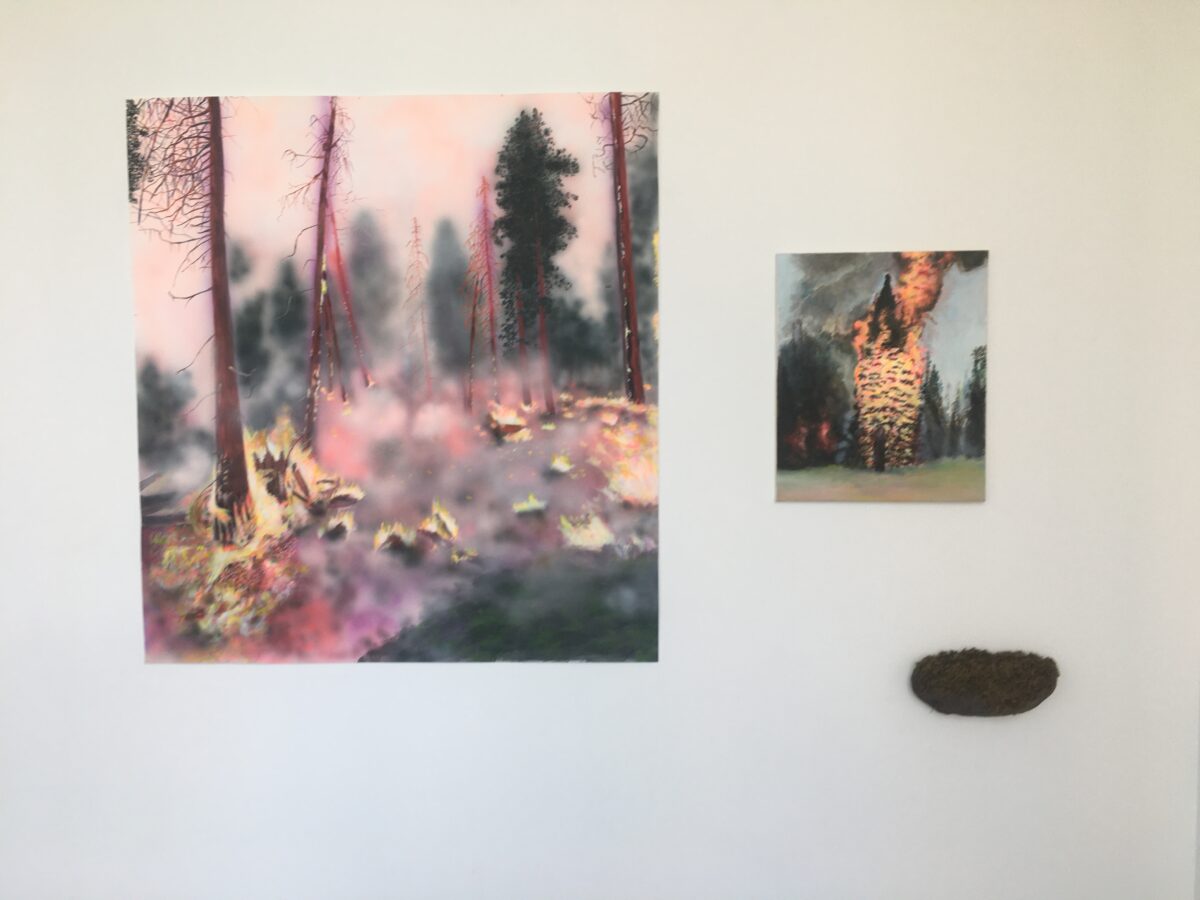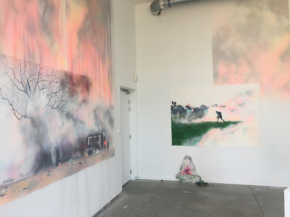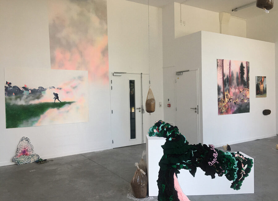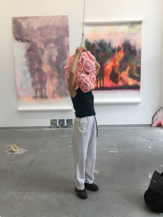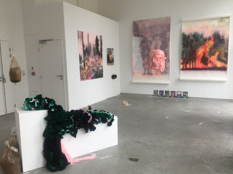 Enfumées, brûlantes, vaporeuses, nos images du monde sont plongées dans les fumées de la rébellion. Tantôt gaz des bombes lacrymogènes des forces de l’ordre, tantôt feux de forêts, ce sont toutes ces émanations brûlantes et irritantes dont l’artiste Laurence Broydé dépeint sur ses toiles. Cachée par ces nuées, la lutte s’active en arrière-plan. Derrière le trouble, se dissimulent les manifestations du mouvement anti-bassines à Sainte-Soline, déclencheur de l’exposition. Depuis quelques années, les peintures de feu habitent l’œuvre de l’artiste qui livre ici des “images iconiques de l’affrontement1”. Ces images de la défense collaborative des réserves d’eau sont la représentation d’un empêchement de la protection de nos milieux par les politiques et rappellent les violences entre les manifestants et les forces de l’ordre. Les écrans de fumée sont aussi symboliques. Ce sont ceux des politiques aux messages embués, mensongers et dangereux. Ils évoquent les barricades que les manifestants essayent de traverser malgré tout. Le trouble diffus nous plonge dans la fumée et cette volonté de passer outre. Nos yeux larmoyants s’irritent, tentent de faire le point sur cette oblitération de la nature. Une double image absurde et ridicule surgit alors : des CRS armés jusqu’au dents, comme en temps de guerre, face aux manifestants qui se protègent en brandissant leurs parapluies. L’artiste, en découvrant le manifeste Réensauvagez-vous !, soulève une part enfouie de nos êtres, encapsu- lée par notre société : la sauvagerie, qui serait chez l’humain, “à l’origine de tout son potentiel de vie2”. C’est finalement en s’intéressant à la polysémie du mot, qu’elle cherche “à remettre du sauvage dans nos vies3”. D’abord, à connotation négative, le terme rappelle un imaginaire colonial ou un champ lexical employé par les politiques pour caractériser les actions combatives des manifestants. En 1998, Jean-Pierre Chevènement, ancien ministre de l’Intérieur, nommait “sauvageons” les contestataires des banlieues avec condescendance. Le de- venir sauvage manifeste ici un désir de liberté, une occasion de reprendre le dessus et de se réapproprier l’espace public : entre fête sauvage et manifestation non-autorisée. Les grandes sculptures de laine s’affirment par une présence organique qui contrebalance ces destructions. Par un processus long de crochet, Laurence Broydé s’accorde à la lente croissance du vivant, crée avec les formes de la nature et met ainsi en œuvre une “économie des communs4”. En suspendant de la mousse et du mycélium de champignons (pleurotes roses et lion mane), elle nous fait goûter à une culture du sous-bois, possiblement soumise à un échec de la pousse. Ne serait-ce que par ses tentatives de faire intervenir des champignons comestibles aux vertus médicinales et aux formes étranges, ainsi que des excrois- sances de laine à porter ou non, elle contribue à créer activement du collectif et des potentialités de transformations. Quoi de plus évocateur que de faire se côtoyer ces humains dans le feu de l’action, des incendies de forêts et des fleurs éteintes ou en voie de disparition ? Tout est affaire de bouleversements naturels induits par le réchauffement climatique et les actions humaines. La faune et la flore s’éteignent silencieusement, sans retour en arrière possible. Ses six dessins de fleurs, posés sobrement au sol, deviennent des icônes de notre monde. Symboles de la disparition, les murs de flammes, eux, débordent, surprennent par leur étendue incontrôlables. Malgré une esthétique attrayante de la couleur, c’est tout le champ tragique de l’écocide, celui des reconquêtes sauvages de nos milieux et de nos libertés que Laurence Broydé aborde.