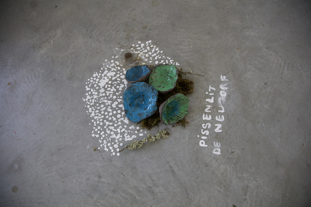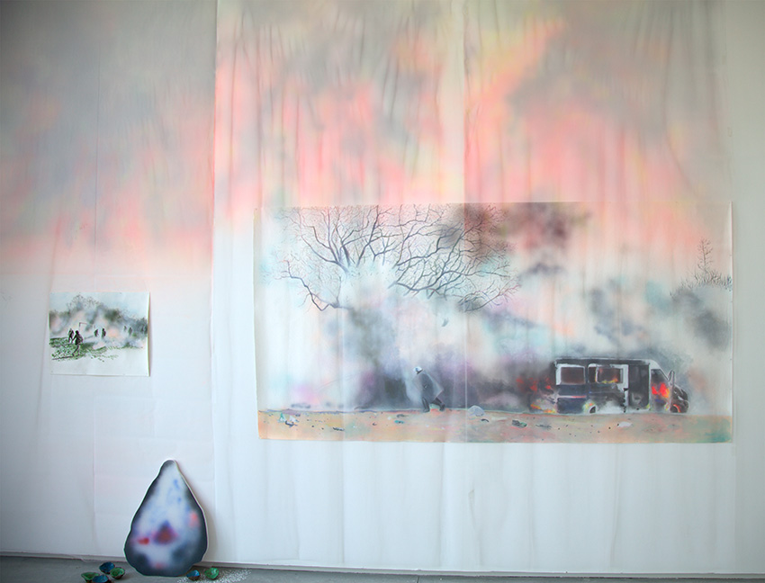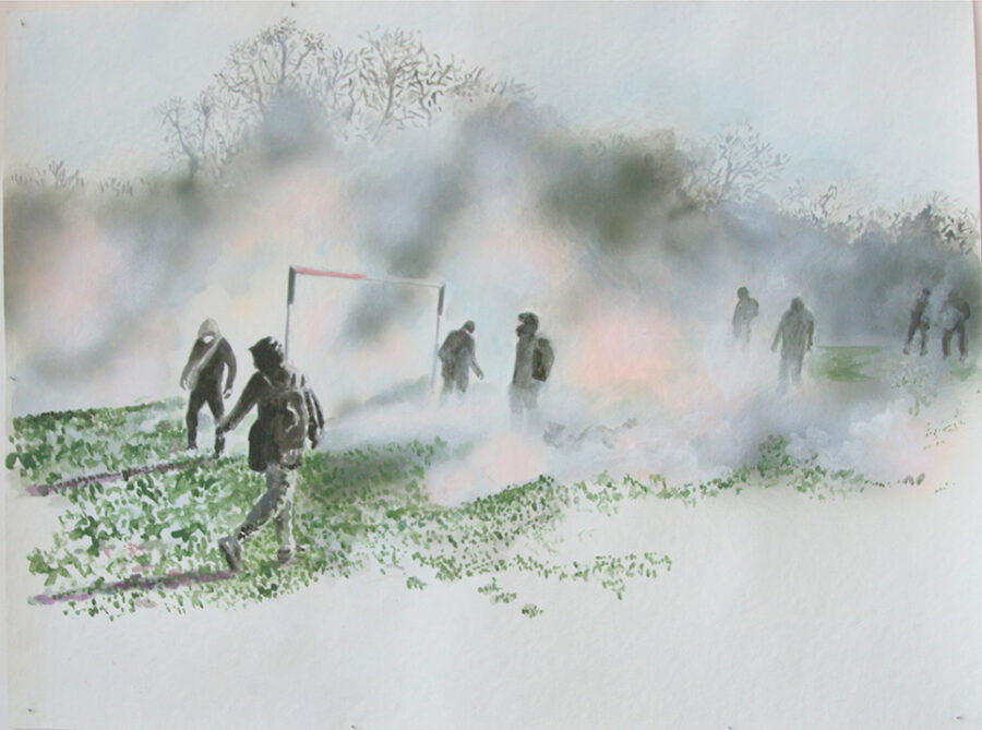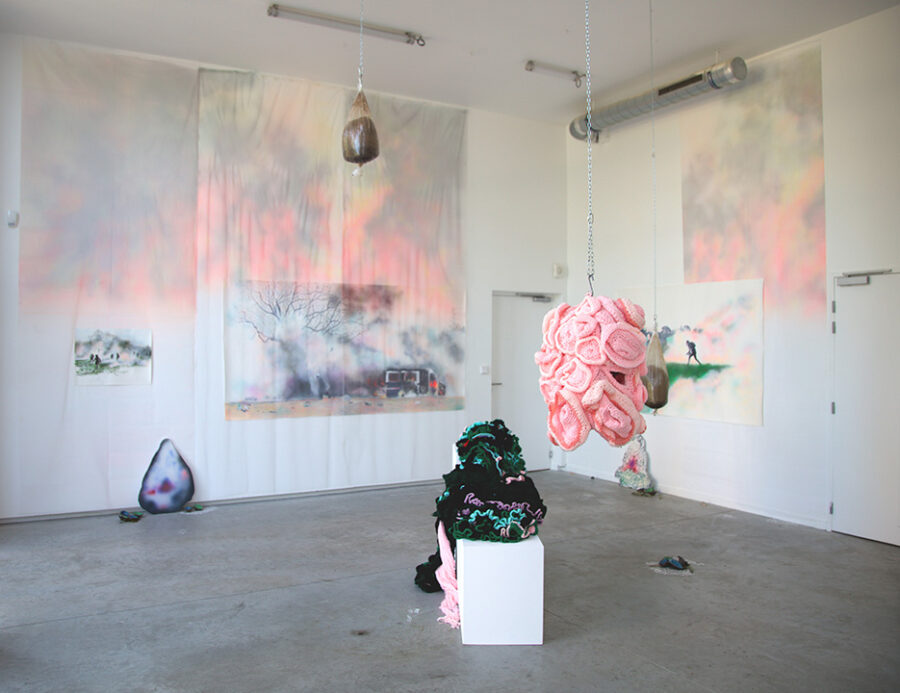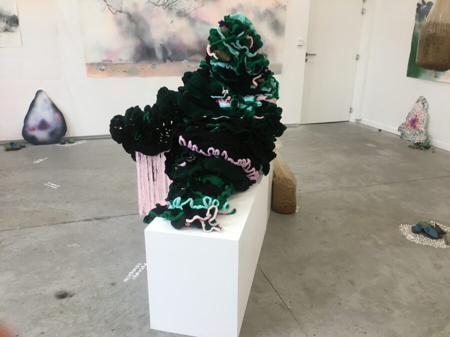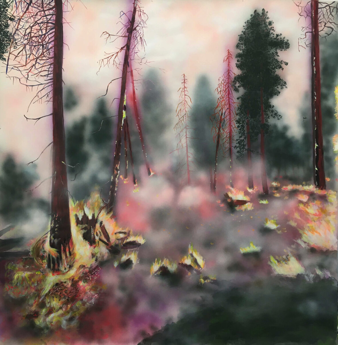 Enfumées, brûlantes, vaporeuses, nos images du monde sont plongées dans les fumées de la rébellion. Tantôt gaz des bombes lacrymogènes des forces de l’ordre, tantôt feux de forêts, ce sont toutes ces émanations brûlantes et irritantes dont l’artiste Laurence Broydé dépeint sur ses toiles. Cachée par ces nuées, la lutte s’active en arrière-plan. Derrière le trouble, se dissimulent les manifestations du mouvement anti-bassines à Sainte-Soline, déclencheur de l’exposition. Depuis quelques années, les peintures de feu habitent l’œuvre de l’artiste qui livre ici des “images iconiques de l’affrontement1”. Ces images de la défense collaborative des réserves d’eau sont la représentation d’un empêchement de la protection de nos milieux par les politiques et rappellent les violences entre les manifestants et les forces de l’ordre. Les écrans de fumée sont aussi symboliques. Ce sont ceux des politiques aux messages embués, mensongers et dangereux. Ils évoquent les barricades que les manifestants essayent de traverser malgré tout. Le trouble diffus nous plonge dans la fumée et cette volonté de passer outre. Nos yeux larmoyants s’irritent, tentent de faire le point sur cette oblitération de la nature. Une double image absurde et ridicule surgit alors : des CRS armés jusqu’au dents, comme en temps de guerre, face aux manifestants qui se protègent en brandissant leurs parapluies. L’artiste, en découvrant le manifeste Réensauvagez-vous !, soulève une part enfouie de nos êtres, encapsu- lée par notre société : la sauvagerie, qui serait chez l’humain, “à l’origine de tout son potentiel de vie2”. C’est finalement en s’intéressant à la polysémie du mot, qu’elle cherche “à remettre du sauvage dans nos vies3”. D’abord, à connotation négative, le terme rappelle un imaginaire colonial ou un champ lexical employé par les politiques pour caractériser les actions combatives des manifestants. En 1998, Jean-Pierre Chevènement, ancien ministre de l’Intérieur, nommait “sauvageons” les contestataires des banlieues avec condescendance. Le de- venir sauvage manifeste ici un désir de liberté, une occasion de reprendre le dessus et de se réapproprier l’espace public : entre fête sauvage et manifestation non-autorisée. Les grandes sculptures de laine s’affirment par une présence organique qui contrebalance ces destructions. Par un processus long de crochet, Laurence Broydé s’accorde à la lente croissance du vivant, crée avec les formes de la nature et met ainsi en œuvre une “économie des communs4”. En suspendant de la mousse et du mycélium de champignons (pleurotes roses et lion mane), elle nous fait goûter à une culture du sous-bois, possiblement soumise à un échec de la pousse. Ne serait-ce que par ses tentatives de faire intervenir des champignons comestibles aux vertus médicinales et aux formes étranges, ainsi que des excrois- sances de laine à porter ou non, elle contribue à créer activement du collectif et des potentialités de transformations. Quoi de plus évocateur que de faire se côtoyer ces humains dans le feu de l’action, des incendies de forêts et des fleurs éteintes ou en voie de disparition ? Tout est affaire de bouleversements naturels induits par le réchauffement climatique et les actions humaines. La faune et la flore s’éteignent silencieusement, sans retour en arrière possible. Ses six dessins de fleurs, posés sobrement au sol, deviennent des icônes de notre monde. Symboles de la disparition, les murs de flammes, eux, débordent, surprennent par leur étendue incontrôlables. Malgré une esthétique attrayante de la couleur, c’est tout le champ tragique de l’écocide, celui des reconquêtes sauvages de nos milieux et de nos libertés que Laurence Broydé aborde.