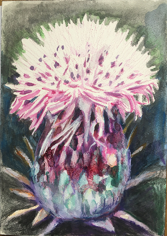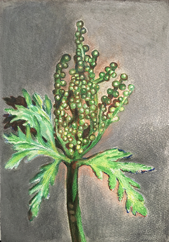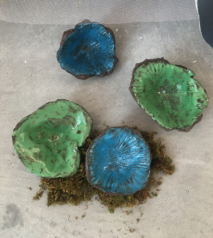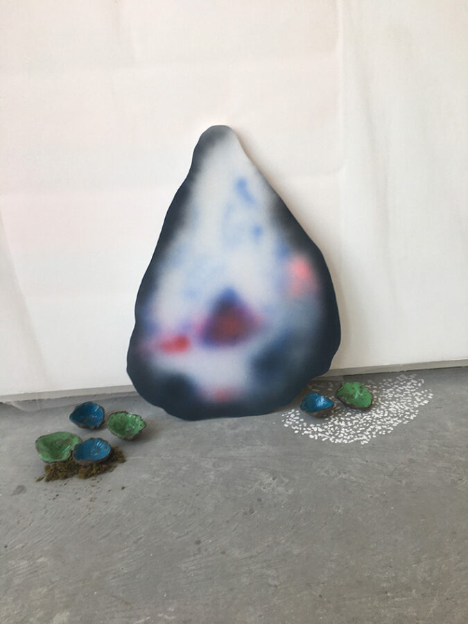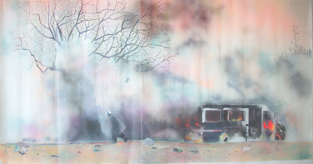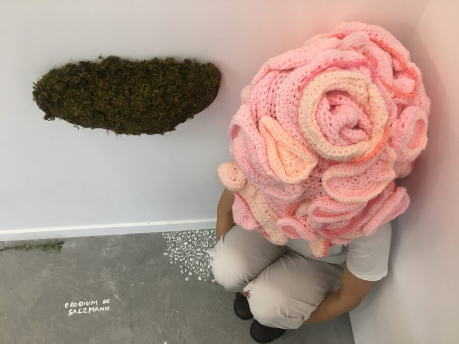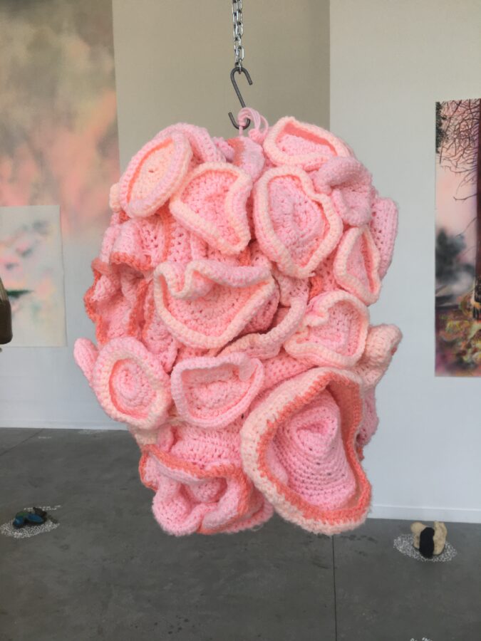 Enfumées, brûlantes, vaporeuses, nos images du monde sont plongées dans les fumées de la rébellion. Tantôt gaz des bombes lacrymogènes des forces de l’ordre, tantôt feux de forêts, ce sont toutes ces émanations brûlantes et irritantes dont l’artiste Laurence Broydé dépeint sur ses toiles. Cachée par ces nuées, la lutte s’active en arrière-plan. Derrière le trouble, se dissimulent les manifestations du mouvement anti-bassines à Sainte-Soline, déclencheur de l’exposition. Depuis quelques années, les peintures de feu habitent l’œuvre de l’artiste qui livre ici des “images iconiques de l’affrontement1”. Ces images de la défense collaborative des réserves d’eau sont la représentation d’un empêchement de la protection de nos milieux par les politiques et rappellent les violences entre les manifestants et les forces de l’ordre. Les écrans de fumée sont aussi symboliques. Ce sont ceux des politiques aux messages embués, mensongers et dangereux. Ils évoquent les barricades que les manifestants essayent de traverser malgré tout. Le trouble diffus nous plonge dans la fumée et cette volonté de passer outre. Nos yeux larmoyants s’irritent, tentent de faire le point sur cette oblitération de la nature. Une double image absurde et ridicule surgit alors : des CRS armés jusqu’au dents, comme en temps de guerre, face aux manifestants qui se protègent en brandissant leurs parapluies. L’artiste, en découvrant le manifeste Réensauvagez-vous !, soulève une part enfouie de nos êtres, encapsu- lée par notre société : la sauvagerie, qui serait chez l’humain, “à l’origine de tout son potentiel de vie2”. C’est finalement en s’intéressant à la polysémie du mot, qu’elle cherche “à remettre du sauvage dans nos vies3”. D’abord, à connotation négative, le terme rappelle un imaginaire colonial ou un champ lexical employé par les politiques pour caractériser les actions combatives des manifestants. En 1998, Jean-Pierre Chevènement, ancien ministre de l’Intérieur, nommait “sauvageons” les contestataires des banlieues avec condescendance. Le de- venir sauvage manifeste ici un désir de liberté, une occasion de reprendre le dessus et de se réapproprier l’espace public : entre fête sauvage et manifestation non-autorisée. Les grandes sculptures de laine s’affirment par une présence organique qui contrebalance ces destructions. Par un processus long de crochet, Laurence Broydé s’accorde à la lente croissance du vivant, crée avec les formes de la nature et met ainsi en œuvre une “économie des communs4”. En suspendant de la mousse et du mycélium de champignons (pleurotes roses et lion mane), elle nous fait goûter à une culture du sous-bois, possiblement soumise à un échec de la pousse. Ne serait-ce que par ses tentatives de faire intervenir des champignons comestibles aux vertus médicinales et aux formes étranges, ainsi que des excrois- sances de laine à porter ou non, elle contribue à créer activement du collectif et des potentialités de transformations. Quoi de plus évocateur que de faire se côtoyer ces humains dans le feu de l’action, des incendies de forêts et des fleurs éteintes ou en voie de disparition ? Tout est affaire de bouleversements naturels induits par le réchauffement climatique et les actions humaines. La faune et la flore s’éteignent silencieusement, sans retour en arrière possible. Ses six dessins de fleurs, posés sobrement au sol, deviennent des icônes de notre monde. Symboles de la disparition, les murs de flammes, eux, débordent, surprennent par leur étendue incontrôlables. Malgré une esthétique attrayante de la couleur, c’est tout le champ tragique de l’écocide, celui des reconquêtes sauvages de nos milieux et de nos libertés que Laurence Broydé aborde.