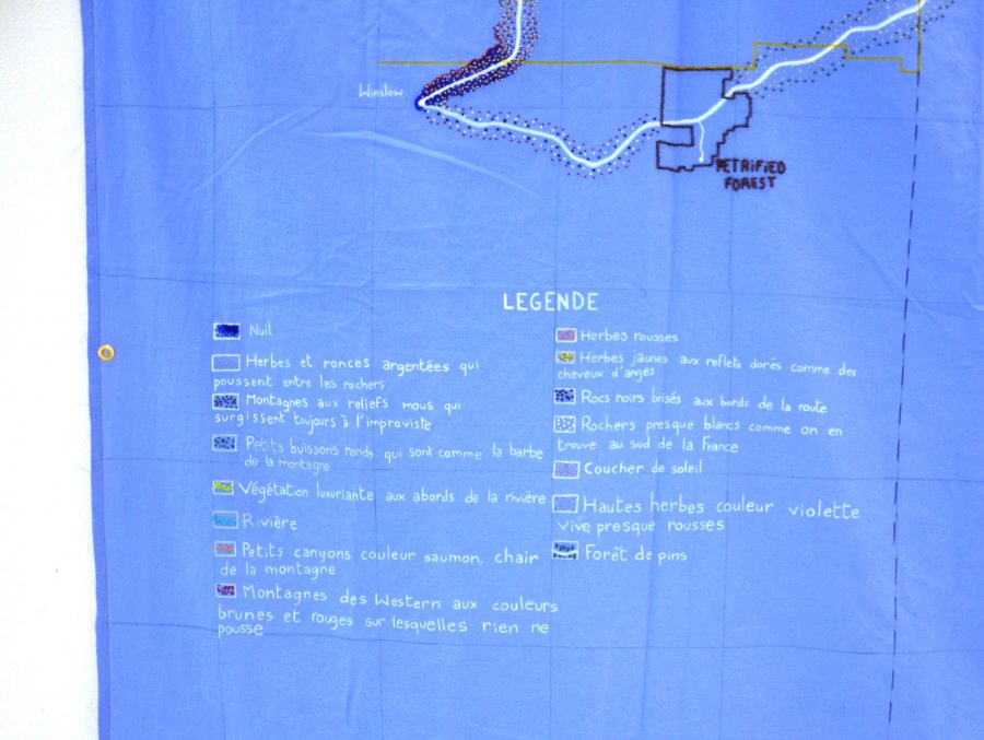 Il y a un aller-retour visuel et mental qui s’effectue sans arrêt au regard de cette carte : chaque point coloré renvoie à sa légende, qui renvoie elle-même à un détail de paysage. Le spectateur est ainsi invité à recréer ce paysage fragmenté au travers des légendes et des pièces sonores qui alimentent la carte. C’est presque un jeu de pistes, où le regard oscille entre le plaisir de se perdre dans les détails de la broderie et la recherche de correspondance à chaque point coloré afin de recréer son propre paysage mental.
