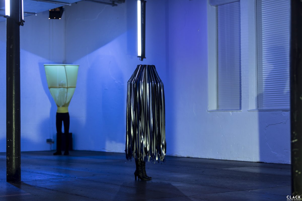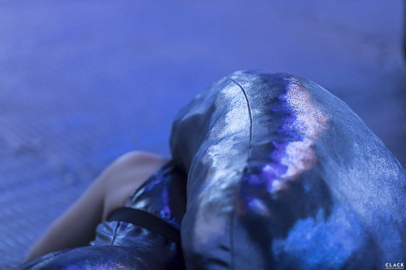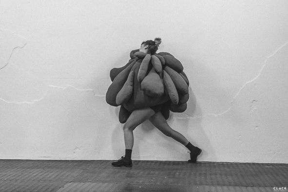 La danse rencontre la sculpture qui devient contrainte dans le déplacement du corps : Elle devient poids, tension mais aussi une seconde peau.