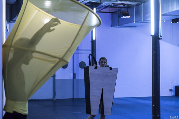 La sculpture cohabite avec le danseur qui s’approprie entièrement cette enveloppe imposée. Des gestes qui nous sont naturels, évidents et quotidiens sont contraints.