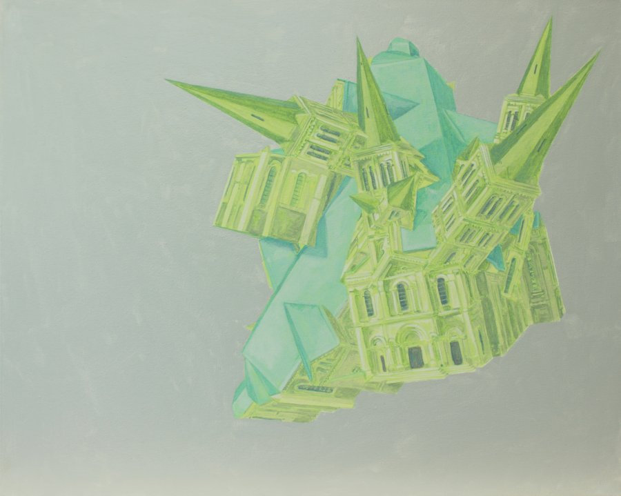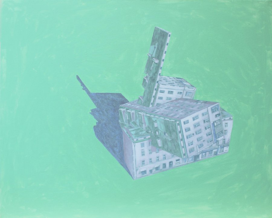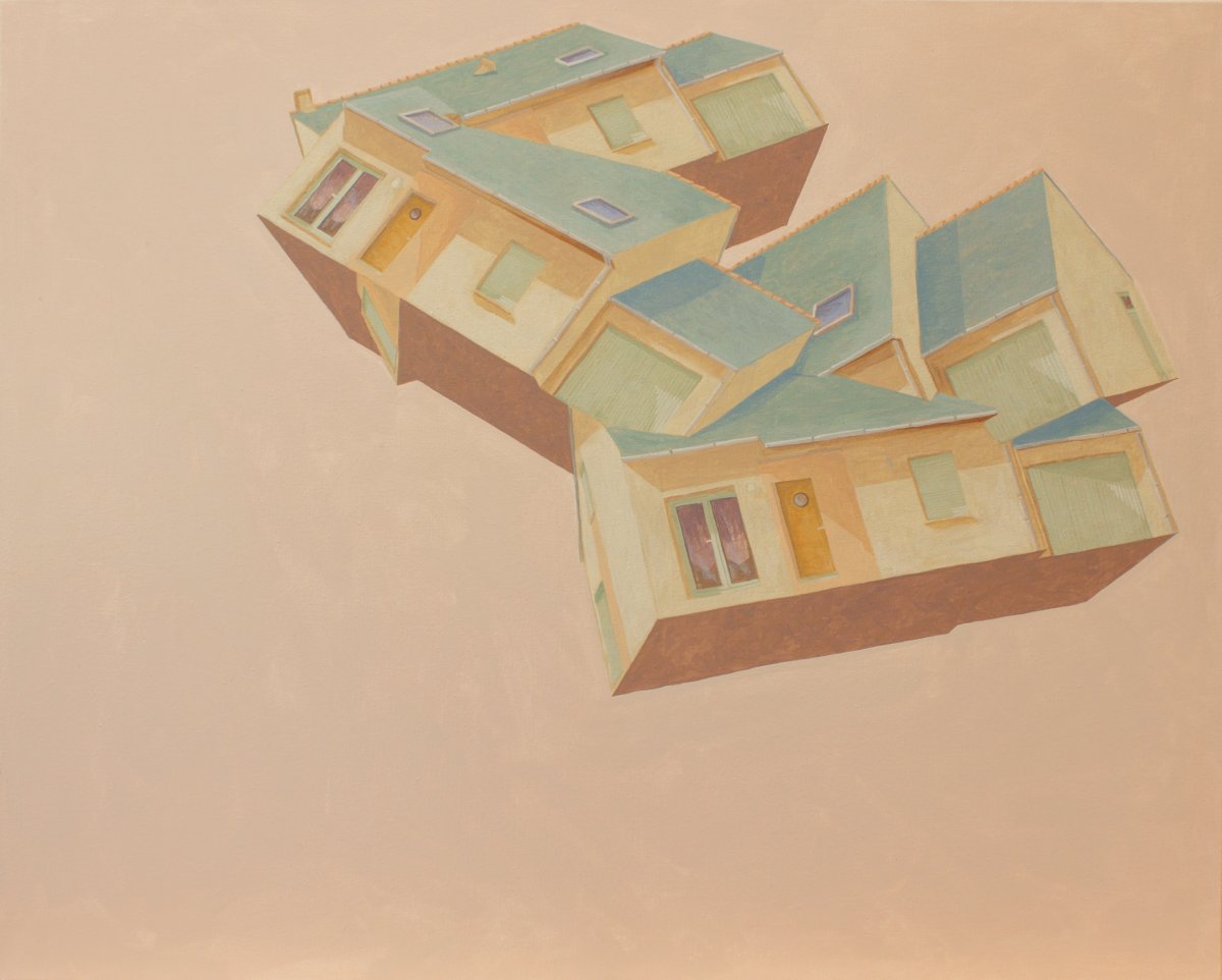 Les peintures de la série « Anomalie » : Elles utilisent la figuration et la banalité comme matière première. Sorte de retour de manipulation après avoir subi une mutation incontrôlée, somme des erreurs générées par le web. Image « artisanale » et « laborieuse » dont les points de départ sont des immeubles 3D captés sur le net. Désormais non plus considéré comme un tout, mais comme une simple brique vouée à une accrétion certaine.