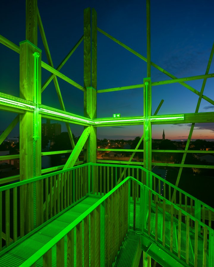 d’un vert/jaune au travers de sa structure. Le point haut, du bâtiment devient « servante ». Un dispositif lumineux