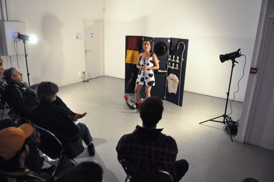 À la manière d’une magicienne transformiste, je raconte chacune de mes visites au Salon de l’agriculture à Paris. Les récits des protagonistes viennent alors se mêler aux histoires des objets confectionnés pour l’occasion présentés ici sur un paravent. Au fur et à mesure du récit, la magicienne devient tour à tour agricultrice, grande championne du concours général agricole, villageoise bethmalaise, bergère, mouton…