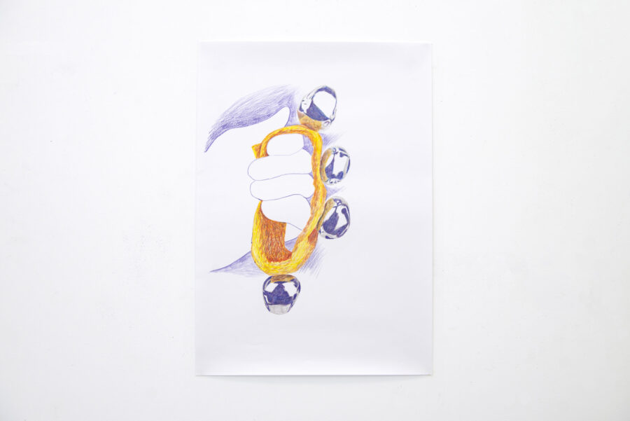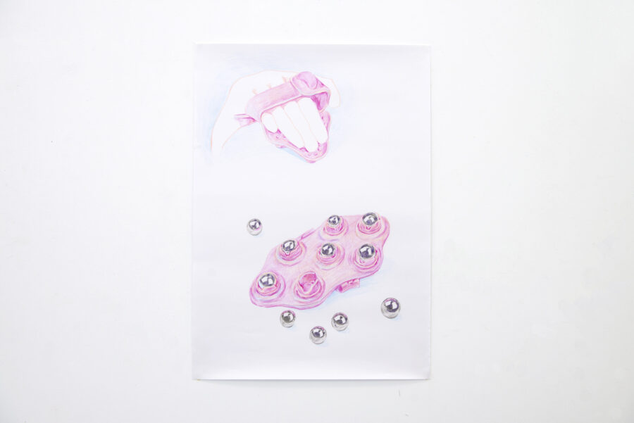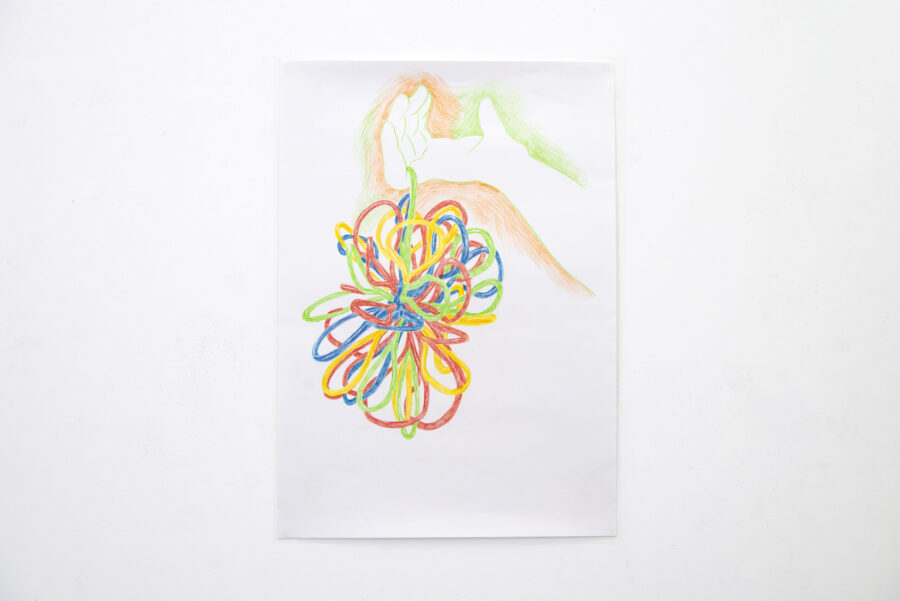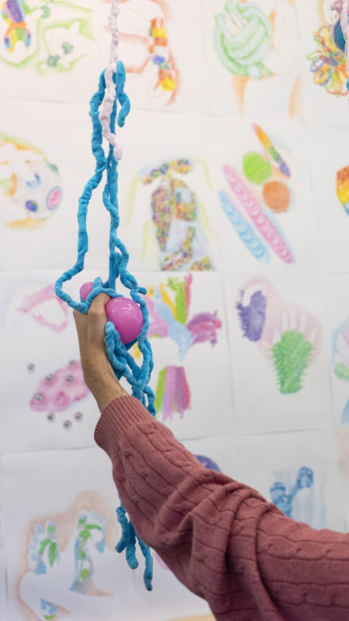 monde saturé d’agitation. À travers une série de dessins colorés et de sculptures textiles intégrant des balles anti-stress, je propose